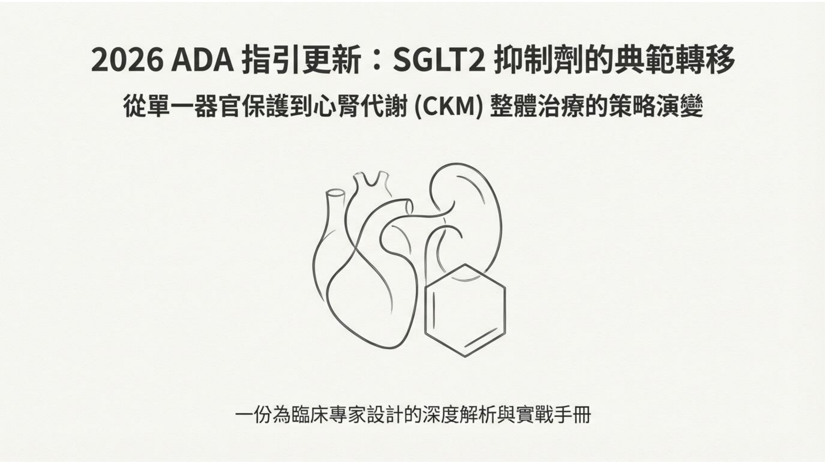 深入解析了 2026 年 ADA 指引中 SGLT 抑制劑(SGLT Inhibitors)角色的重大演變。這不僅是藥物使用順序的調整,更是一場從單一器官保護轉向 「心-腎-代謝(Cardio-Renal-Metabolic, CKM)」 整體照護的哲學變革。