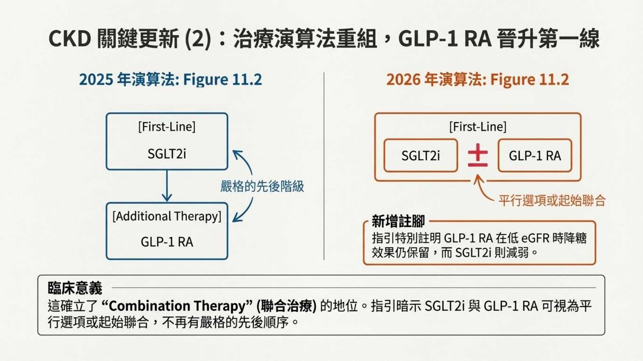腎臟病治療的演算法出現了結構性的重組。過去 SGLT2i 是絕對的第一線,GLP-1 RA 往往被視為次要的「疊加選項」或「替代品」。但在 2026 年的演算法中,GLP-1 RA 被提升至與 SGLT2i 並列的位置,兩者皆為 「第一線藥物(First-Line)」。