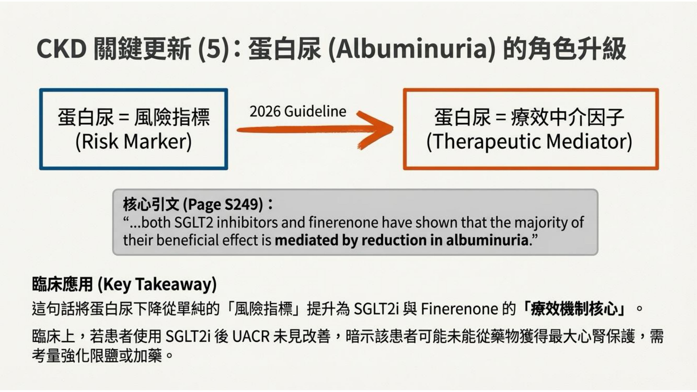 這是一個概念上的重大昇華。過去我們將蛋白尿視為腎臟風險的指標(Risk Marker),但在 2026 年,指引將其地位提升為 「療效中介因子(Therapeutic Mediator)」。指引明確指出,SGLT2i 與 Finerenone 的大部分臨床獲益,其實是 「透過減少蛋白尿來介導的(mediated by reduction in albuminuria)」。