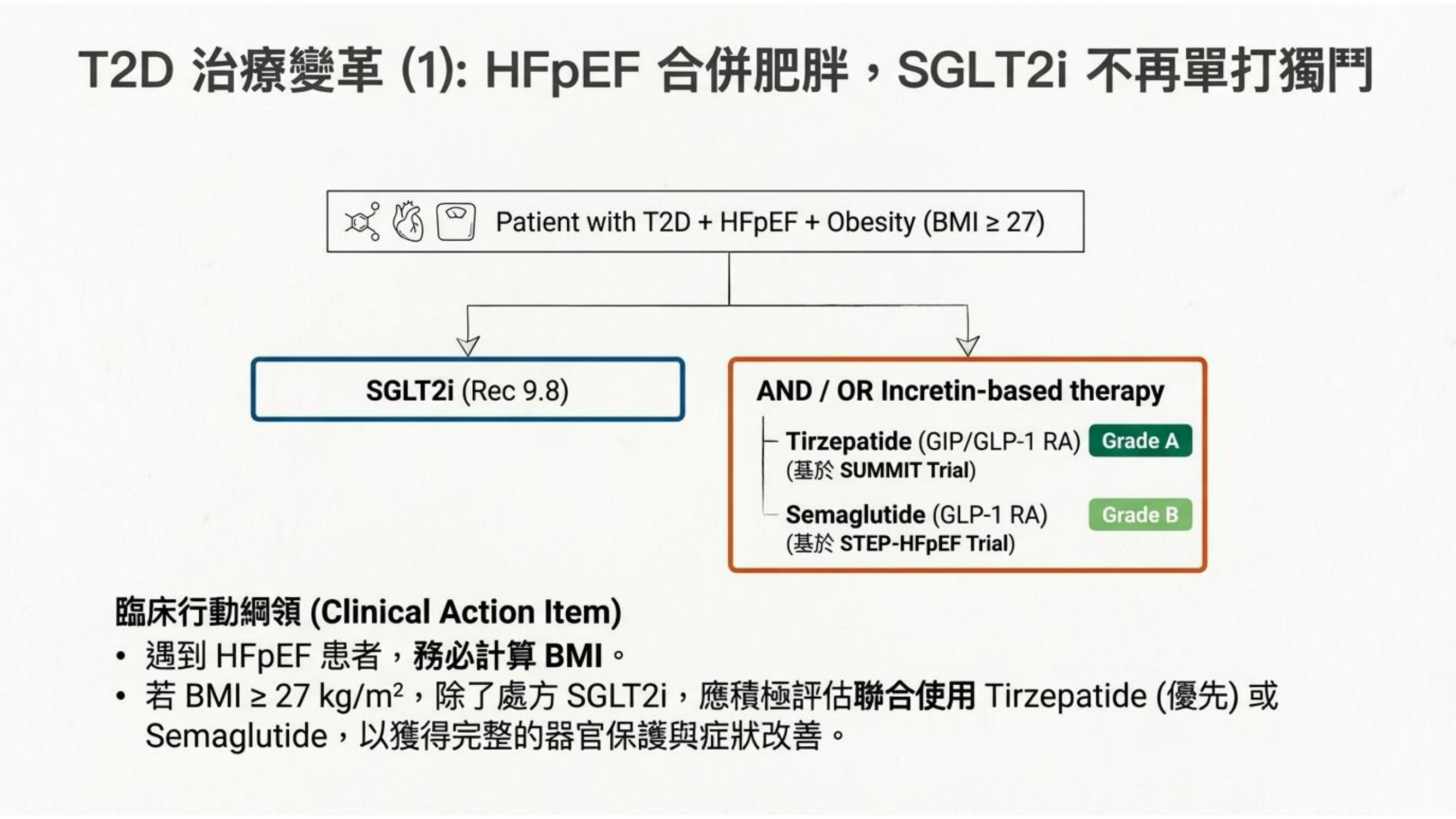 其中,Tirzepatide 基於 SUMMIT 試驗降低心衰竭事件的成果,獲得了 Grade A 的最高推薦;而 Semaglutide 則基於 STEP-HFpEF 試驗改善症狀的成果,獲得 Grade B 推薦。臨床醫師在面對此類患者時,務必計算 BMI,若符合標準,應主動採取 SGLT2i + Incretin 的組合,以獲得完整的器官保護與症狀改善。