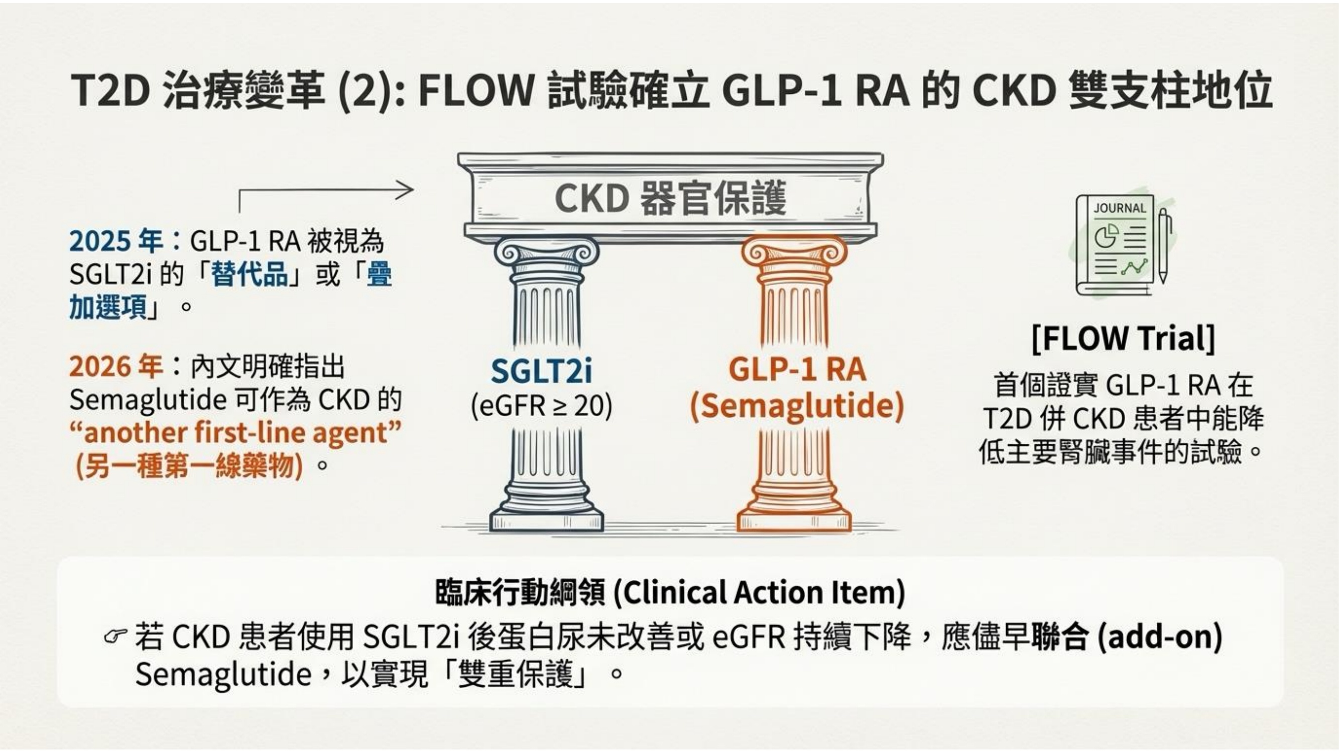 FLOW 試驗的成功,徹底改變了 GLP-1 RA 在腎臟病治療中的地位。過去它被視為 SGLT2i 的替代品,現在指引明確指出 Semaglutide 可作為 CKD 的 「另一種第一線藥物(another first-line agent)」。這意味著 GLP-1 RA 正式成為 CKD 治療的 「雙支柱」 之一。