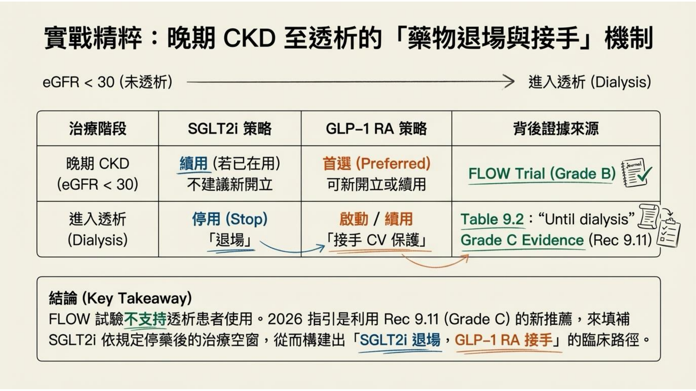 - 退場與接手: SGLT2i 應持續使用至腎衰竭(透析/移植)才停用,透析後則由 GLP-1 RA 接手進行心血管保護。