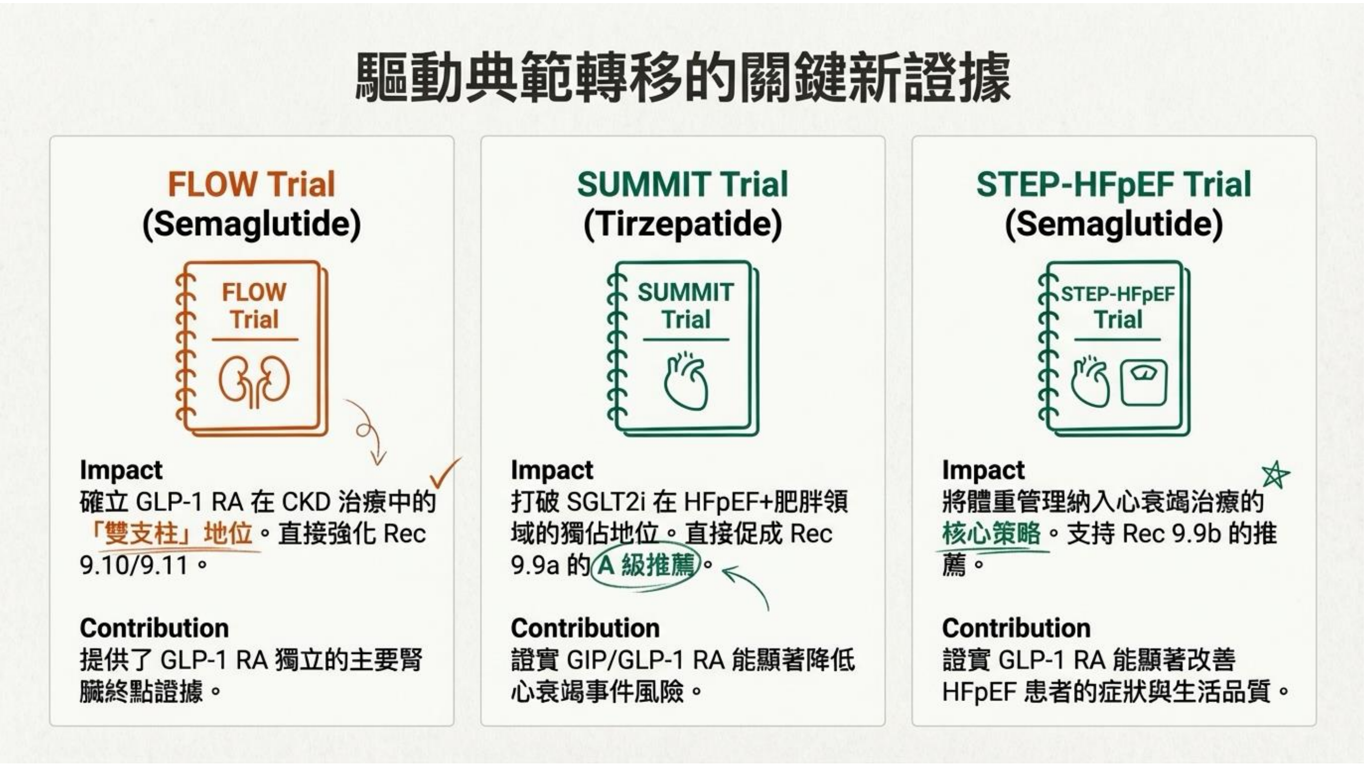 - SUMMIT 試驗: 證實 Tirzepatide 能顯著降低心衰竭事件風險,打破了 SGLT2i 在 HFpEF 合併肥胖領域的獨佔地位,直接促成了 Grade A 的推薦。