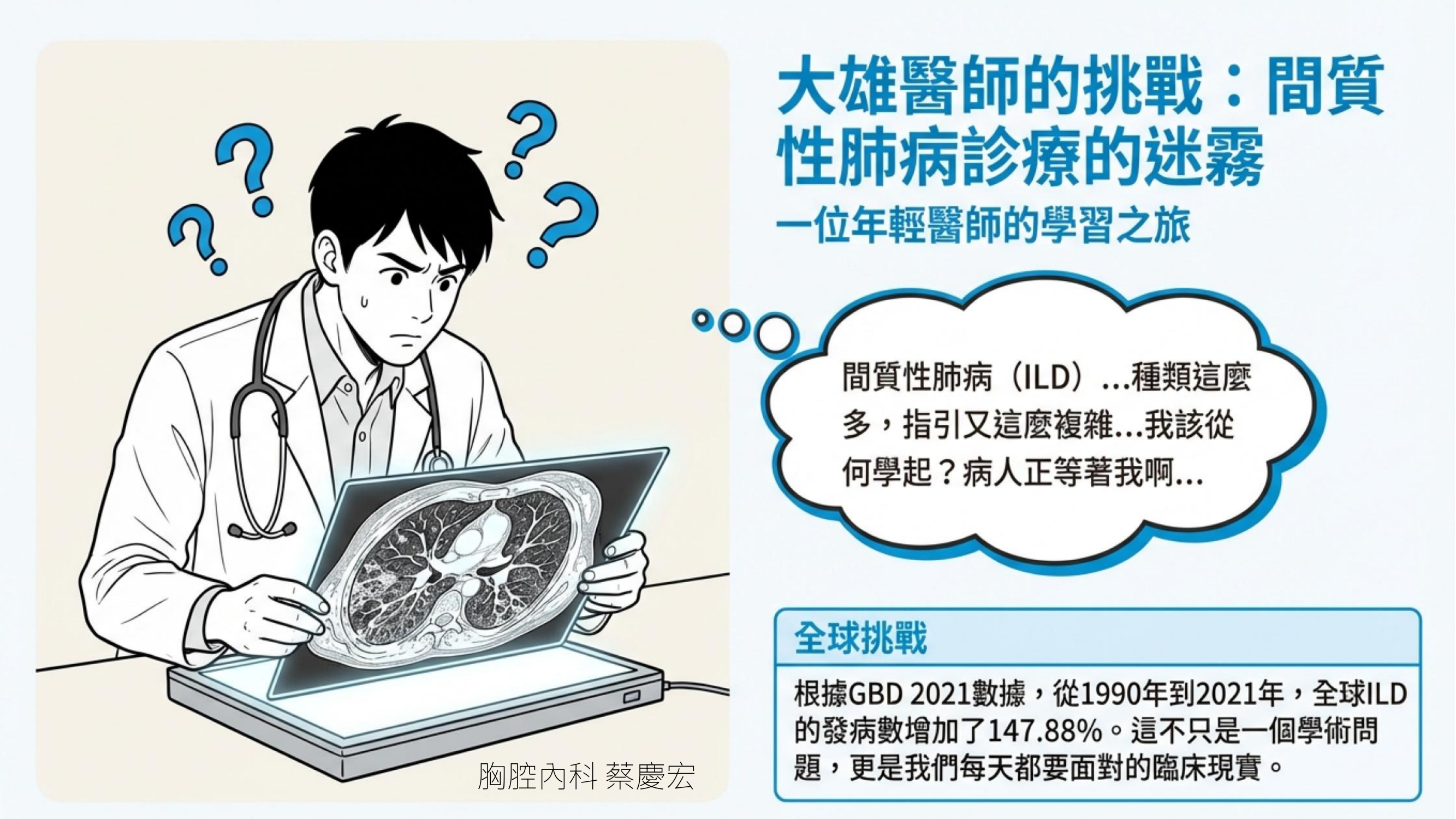 間質性肺病(ILD)在過去被視為極度困難的領域,內科專科考試每年約考 2-3 題,主要測試基本概念。然而,這不僅對年輕醫師是挑戰,連擁有 20 年經驗的主治醫師也常感到棘手,甚至需要不斷更新最新的 Update 才能掌握。 ILD 長期被忽略的主因在於其複雜度過高,難以單一疾病概括。