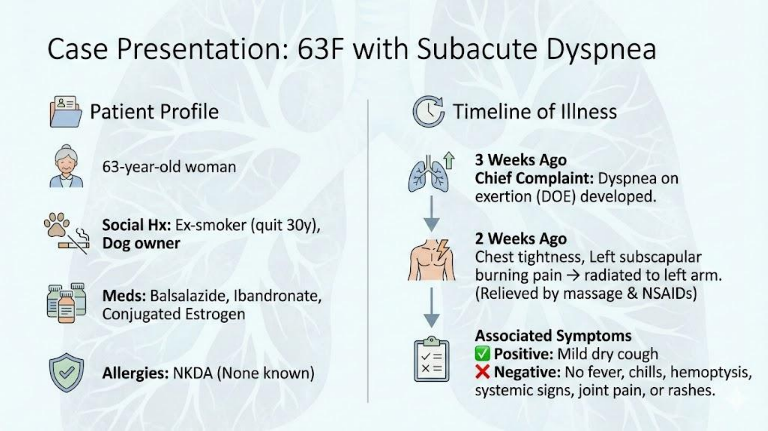 - 病患背景:63歲女性,前吸菸者(Ex-smoker,已戒菸 30 年),家中養兩隻狗。