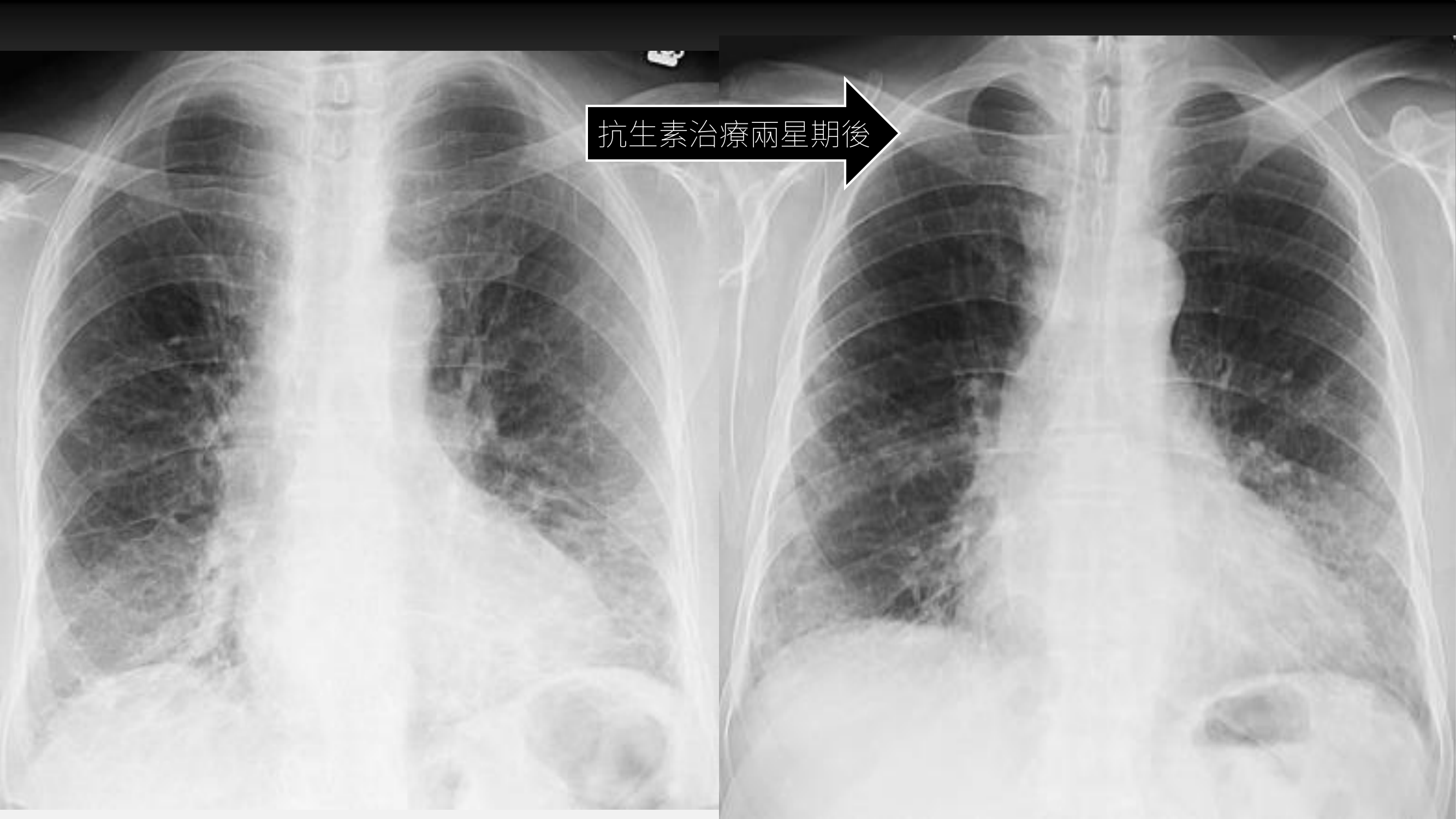 - 初期被誤以為肺炎,使用抗生素治療兩週後,影像局部進步但整體變化不大。