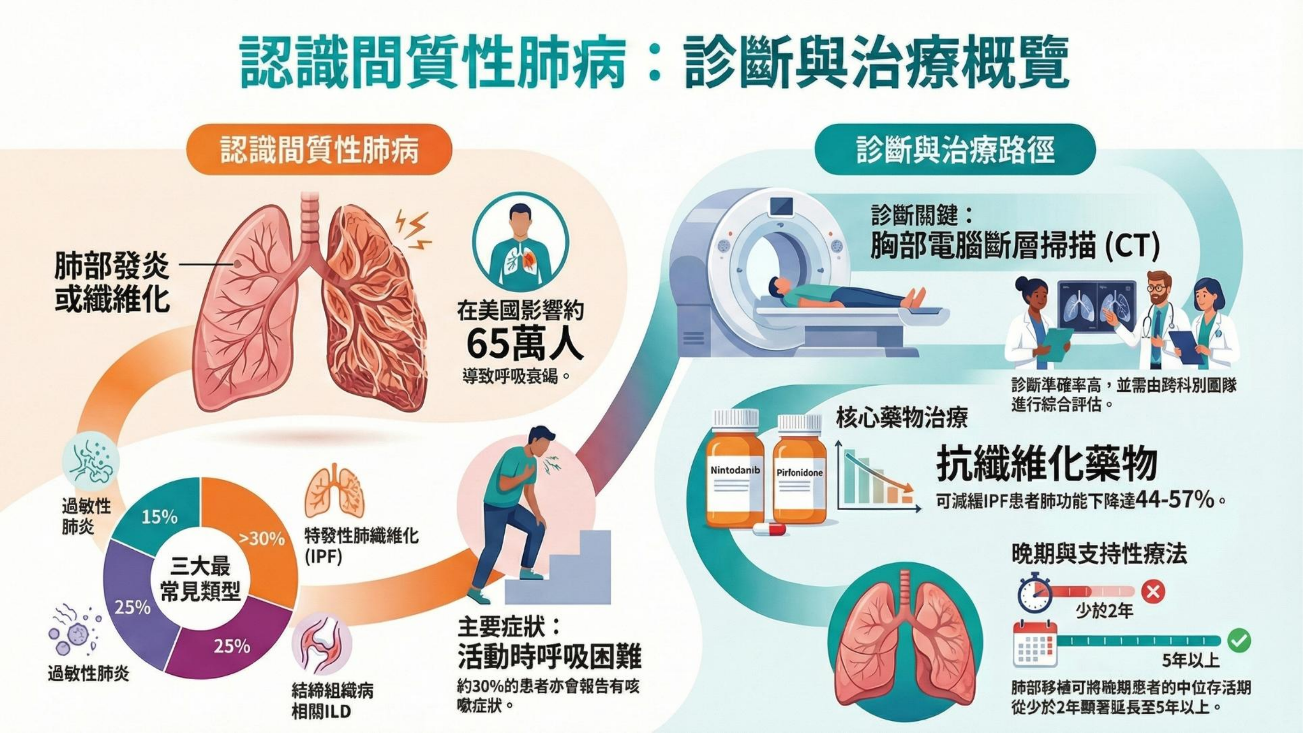 - 終末纖維化:膠原蛋白過度沉積,導致不可逆的纖維化(Fibrosis)。一旦進入此階段,肺部結構無法回復,藥物僅能減緩惡化。