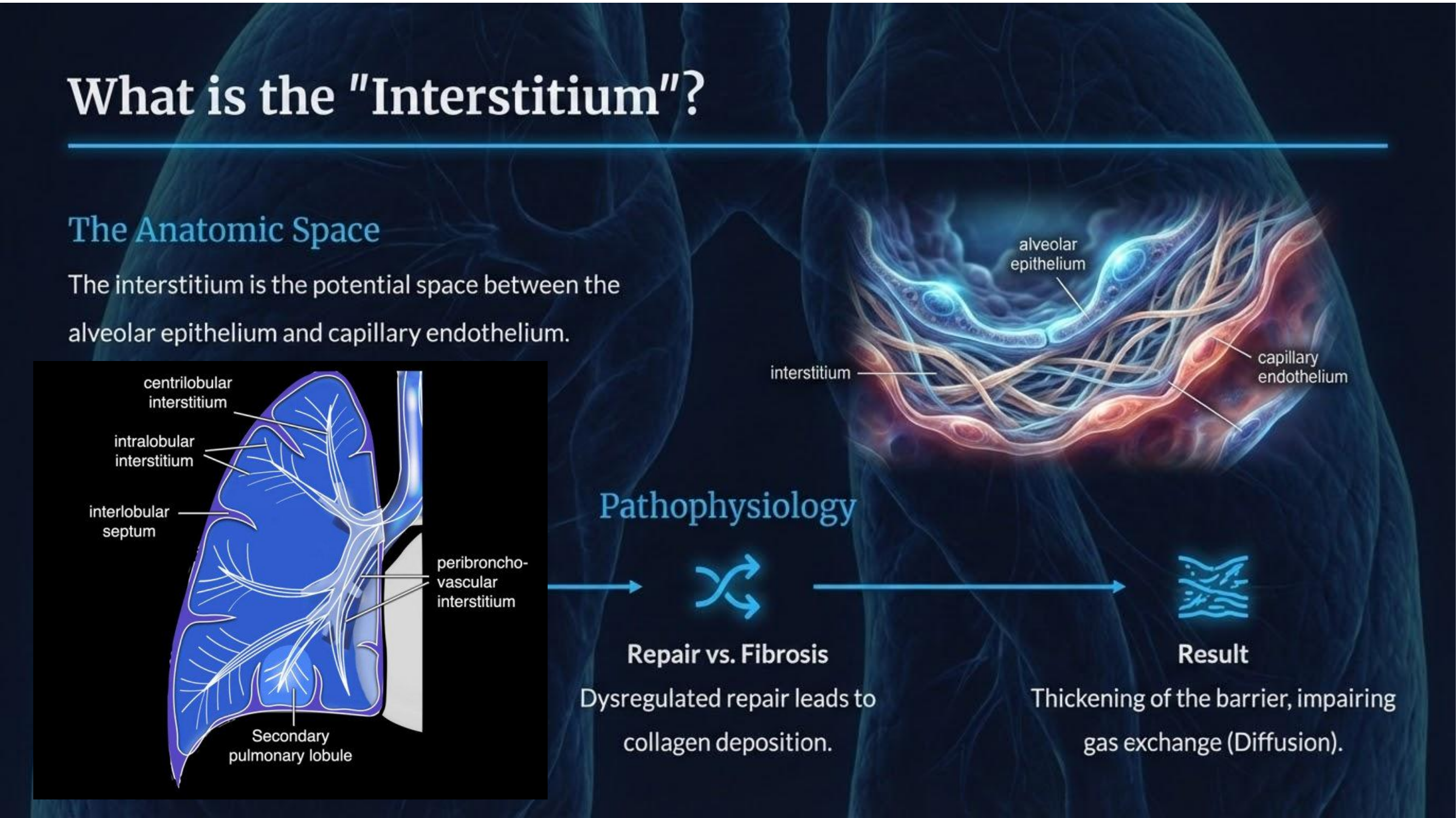 - 病變後果:當間質受損、修復並纖維化後,會導致肺泡壁增厚,直接造成氣體交換受阻(Diffusion impairment)與限制性通氣障礙。