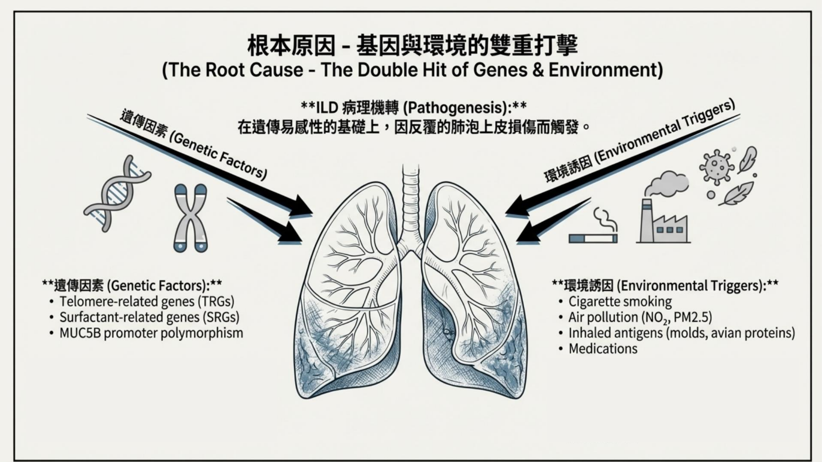 ILD 的發生通常源於「基因」與「環境」的交互作用,稱為「雙重打擊(Double hit)」,類似癌症的發展過程。
