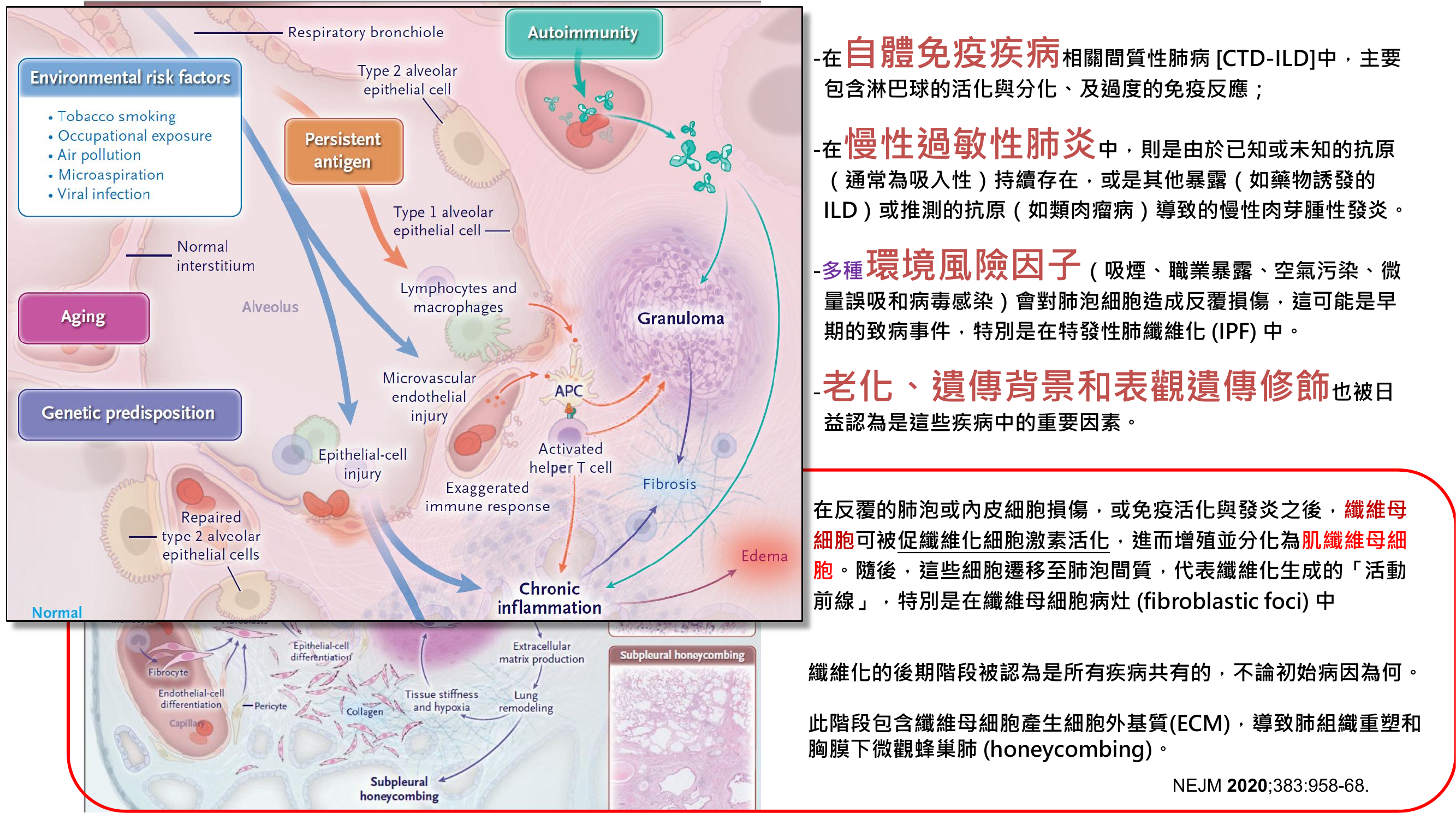 - 病因:最常見原因為過敏性肺炎(HP),也可能來自吸入性損傷。