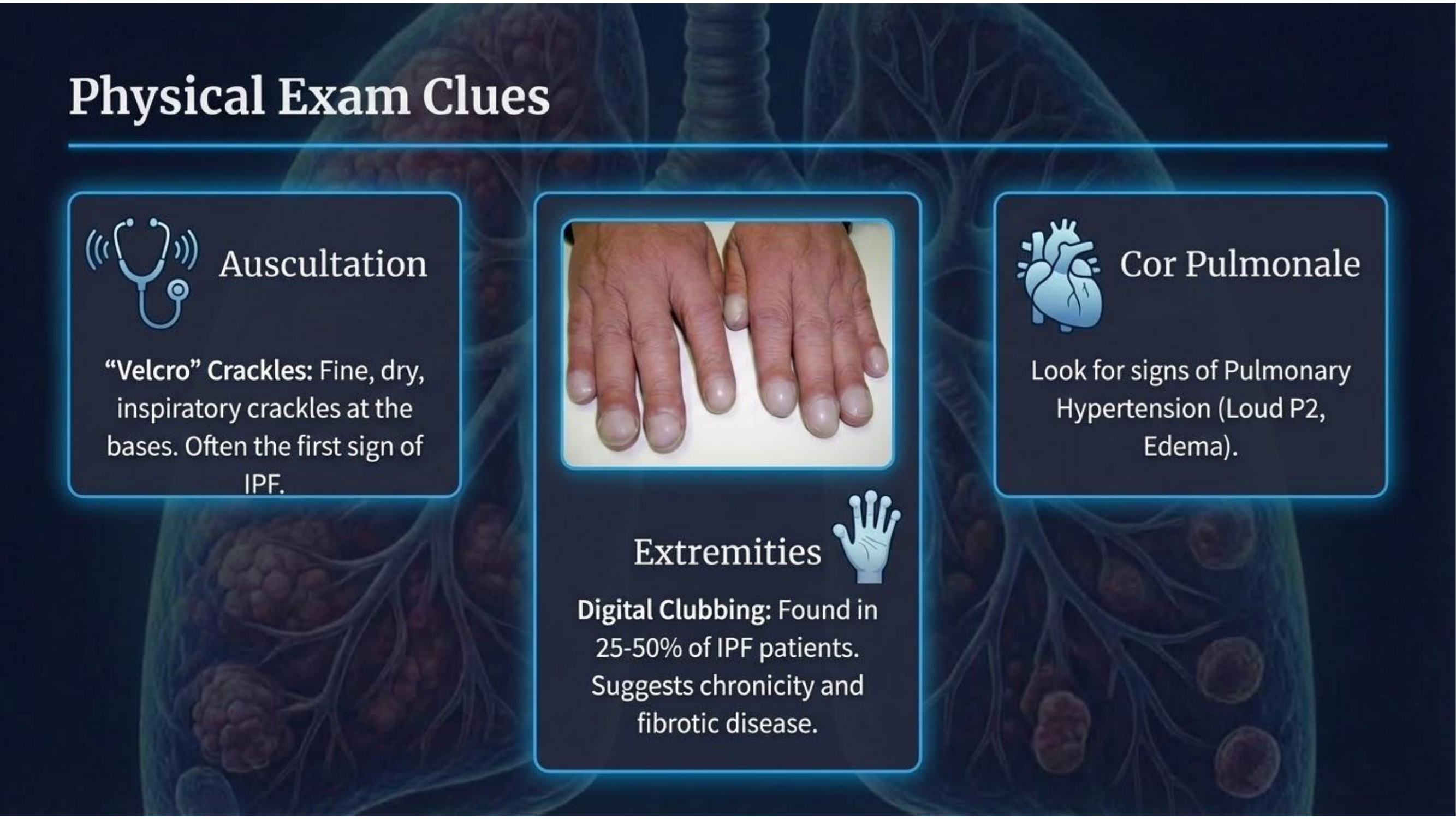- Clubbing finger(杵狀指):約 1/4 到 1/2 的特發性肺纖維化(IPF)病人會出現。