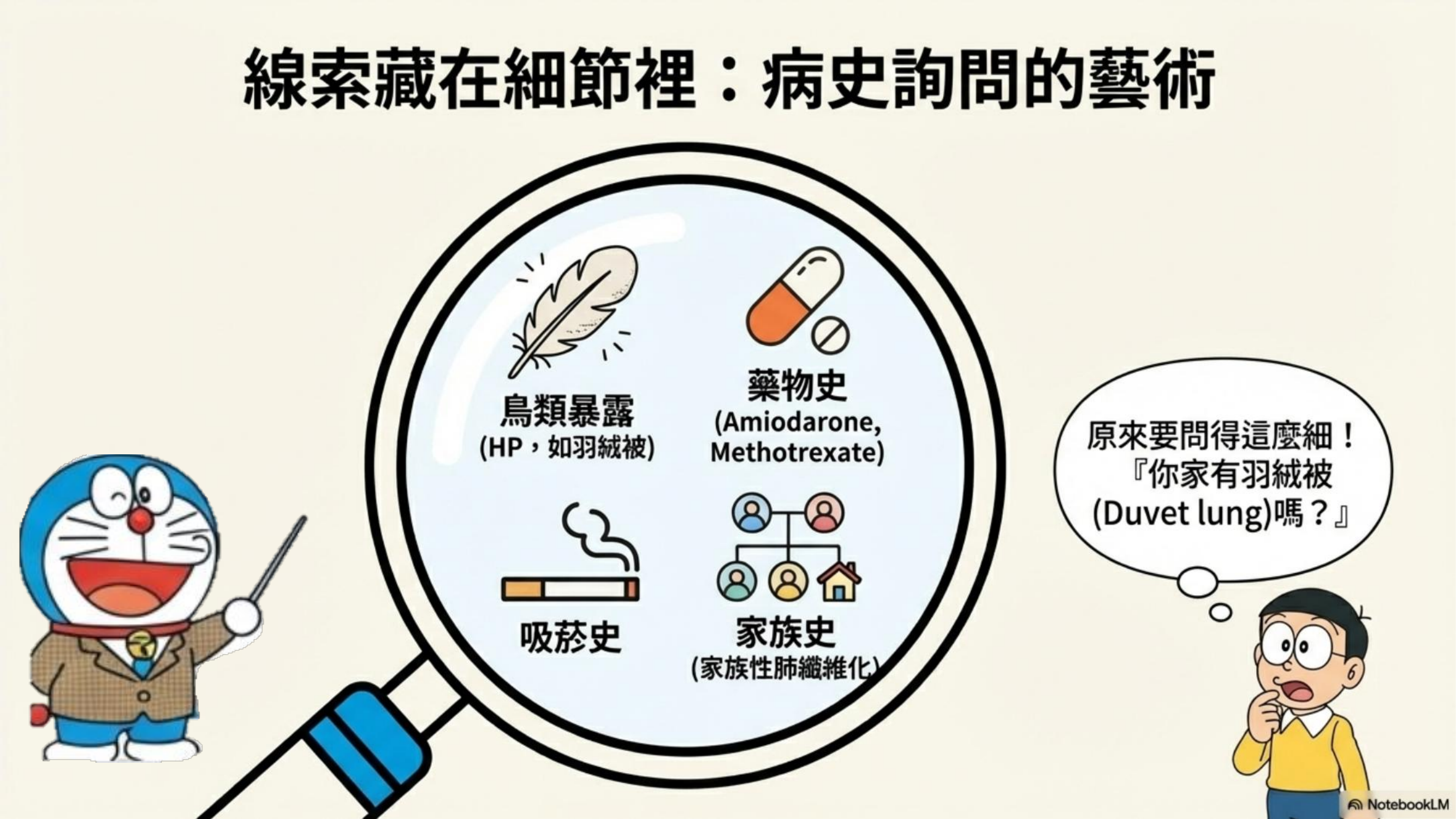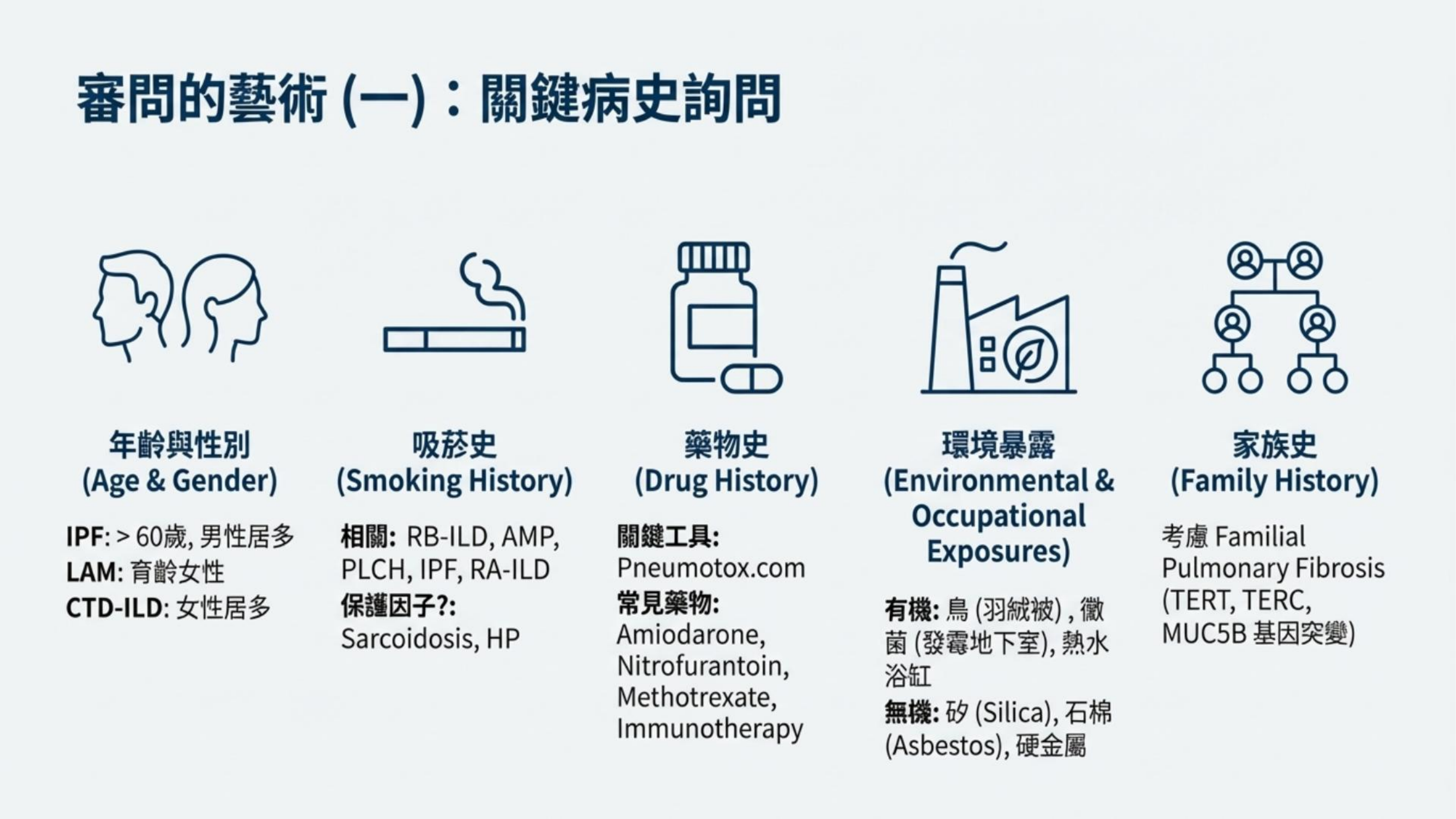 診斷 ILD 如同偵探辦案,必須進行極度詳細(Detail)的審問: