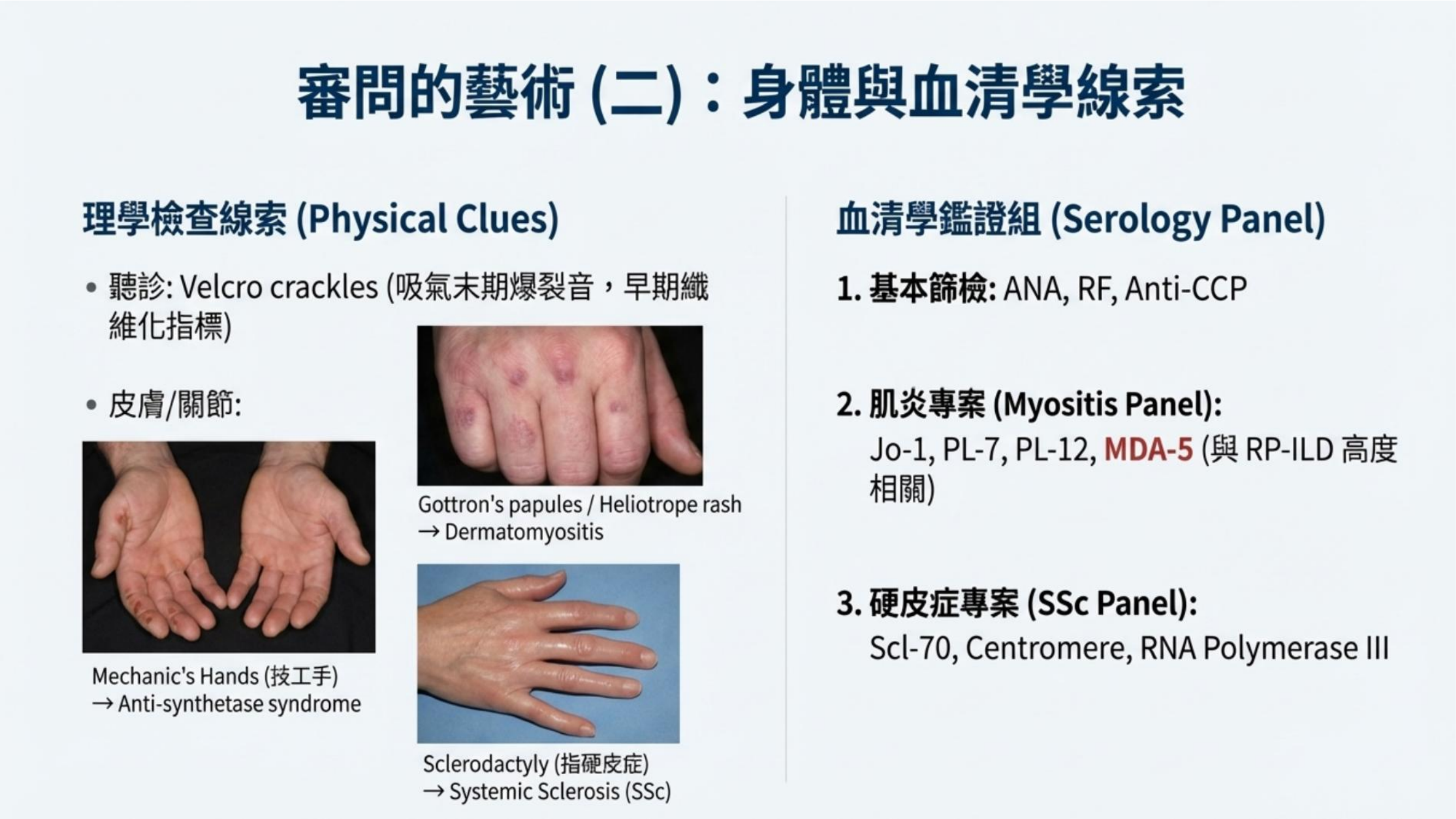 - 自體免疫徵兆:(Slide S16) 注意手部特徵,如 Gottron's papules(皮肌炎)、Mechanic's Hands(技工手,抗合成酶症候群)、Sclerodactyly(指硬皮症)。