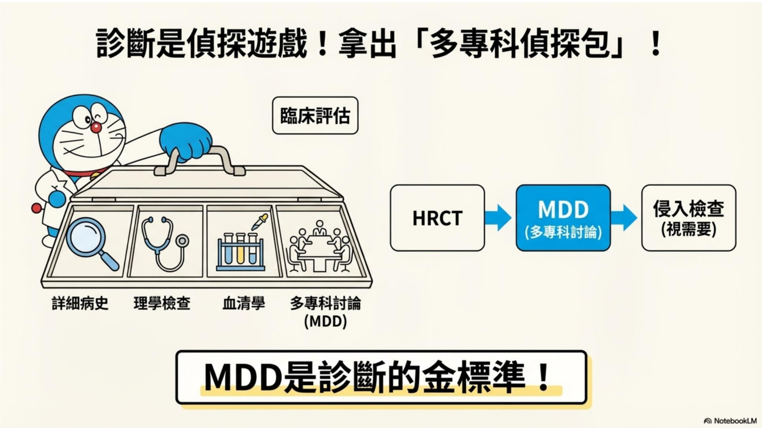 - 流程:病史 + 理學檢查 + 血清學 + HRCT -> MDD。