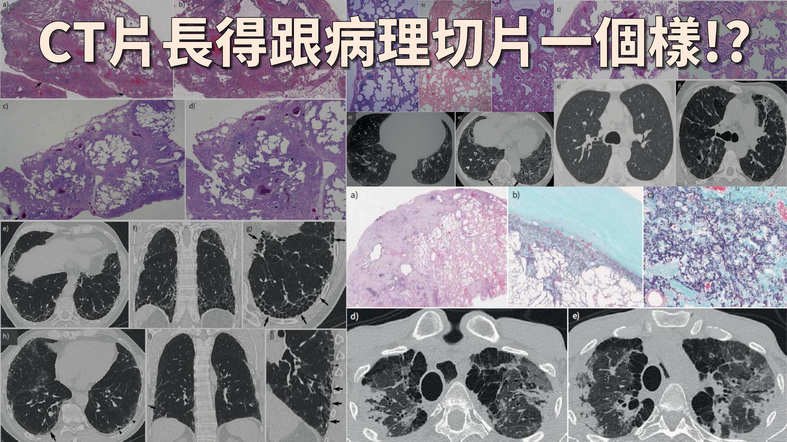 HRCT(高解析度電腦斷層)是目前診斷的基石(2022 Guidelines),地位甚至超越病理切片。因為切片風險高(氣胸、出血),且能判讀間質病理的專家極少(台灣可能不超過 10 位)。HRCT 判讀需將影像對應到微觀病理。
