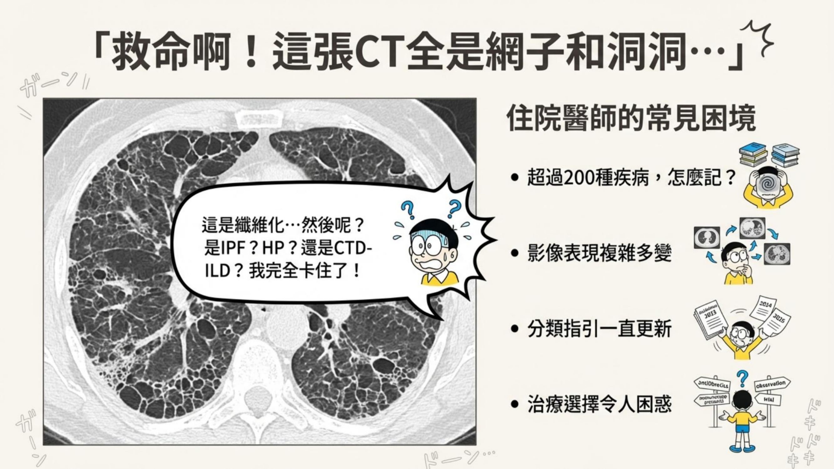 - 啟示:這凸顯了 ILD 的診斷極度耗時且困難,常需從影像、病理到臨床反覆推敲。