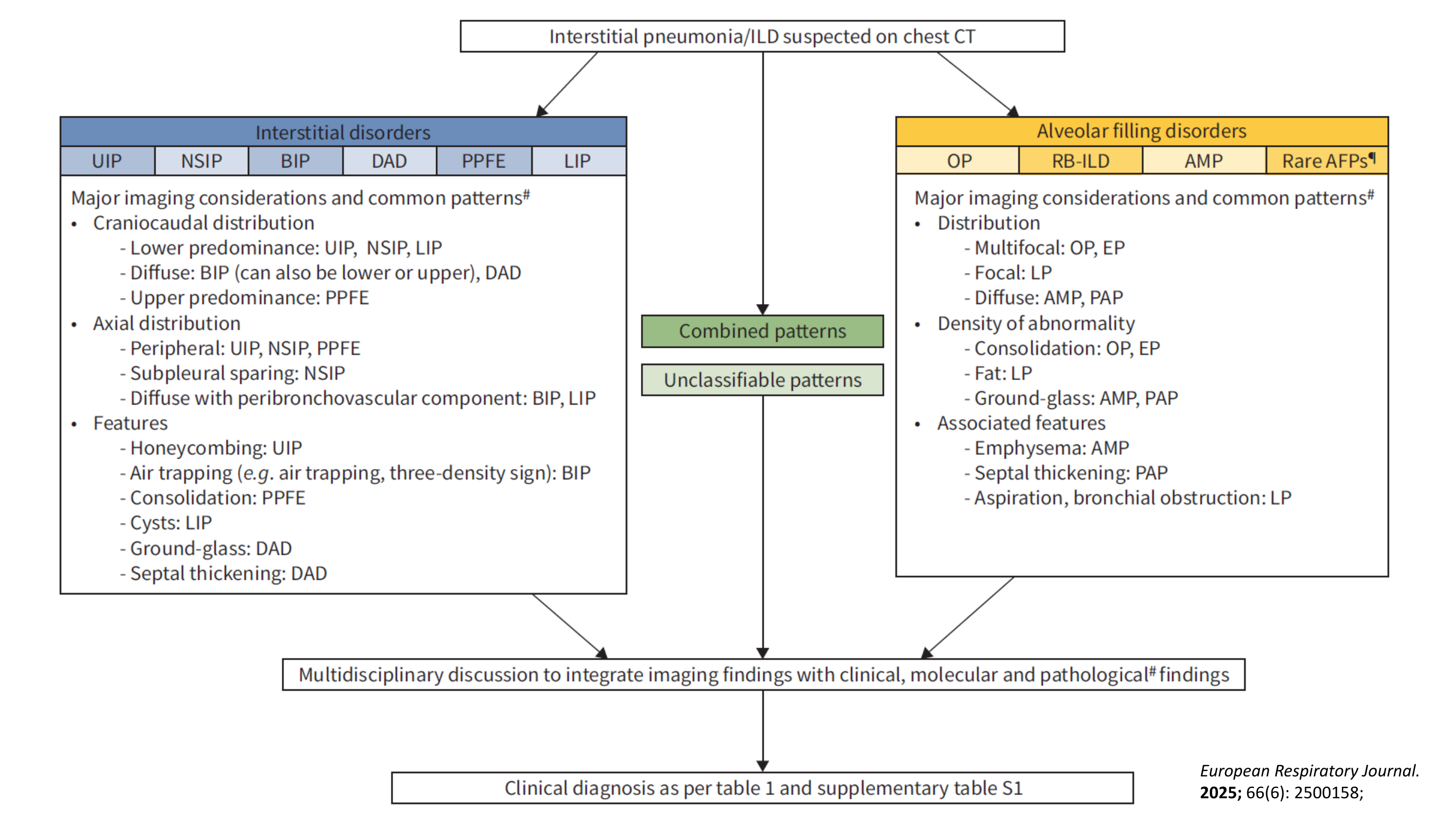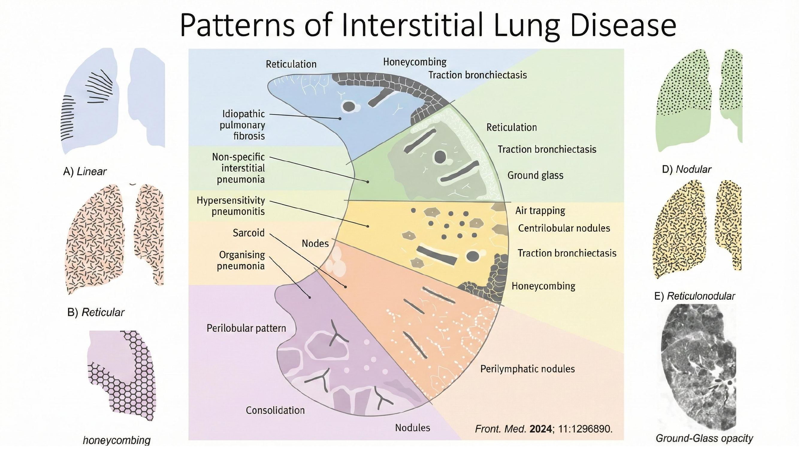 - Interstitial Patterns: UIP, NSIP, BIP, DAD, LIP, PPFE.