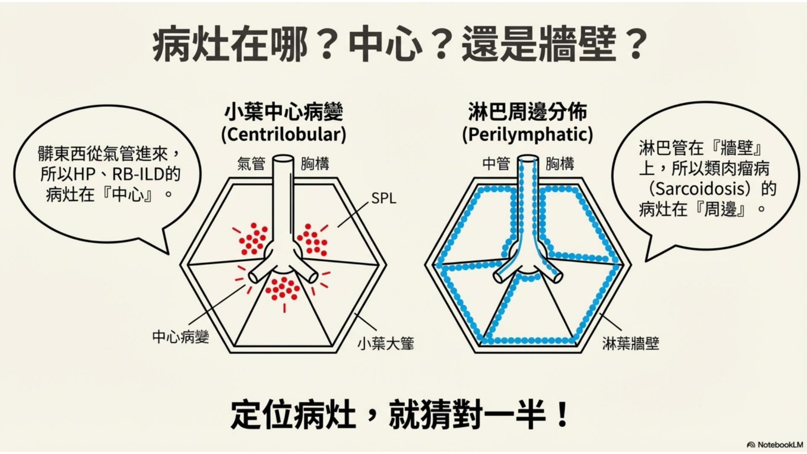 - A: 癌症細胞有特定的突變標記可染色,但 ILD 的病理變化(如纖維化、發炎細胞浸潤)使用的是身體「正常」的細胞(如巨噬細胞、纖維母細胞、淋巴球),只是排列組合錯亂或數量異常,因此 IHC 染不出特異性。且 ILD 往往呈現混合型態(Mixed pattern),是一個動態過程(Process),切片只能看到局部(Snap-shot),難以還原全貌。