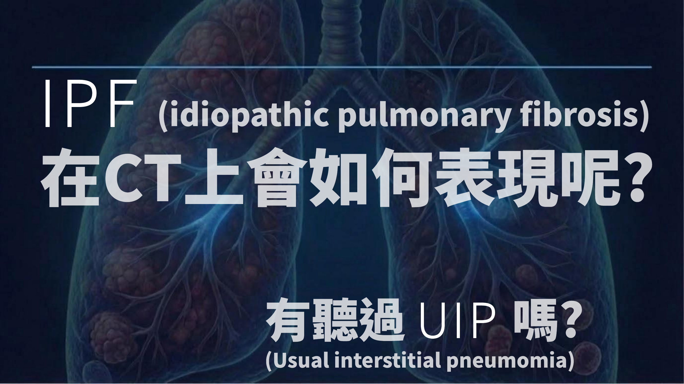 演講者論述: 影像呈現主要分為四大類:Linear/Reticular(網狀)、Honeycombing(蜂窩狀)、Nodular(結節狀)、Ground glass(毛玻璃)。