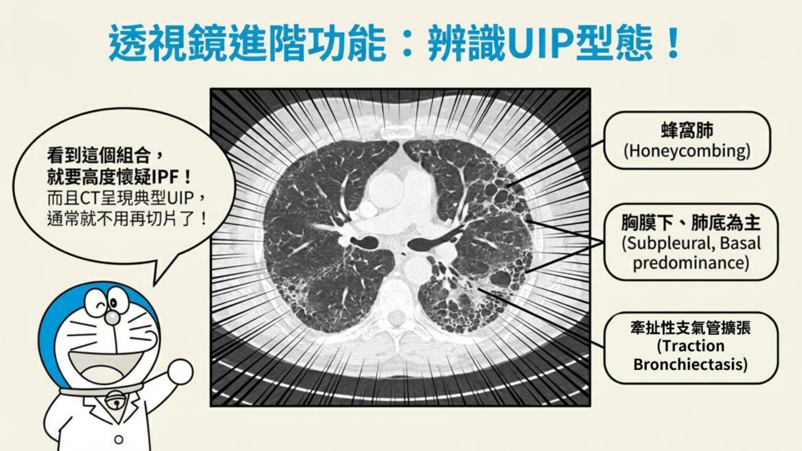- 臨床意義:看到典型 UIP pattern,若排除已知原因,即為 IPF。