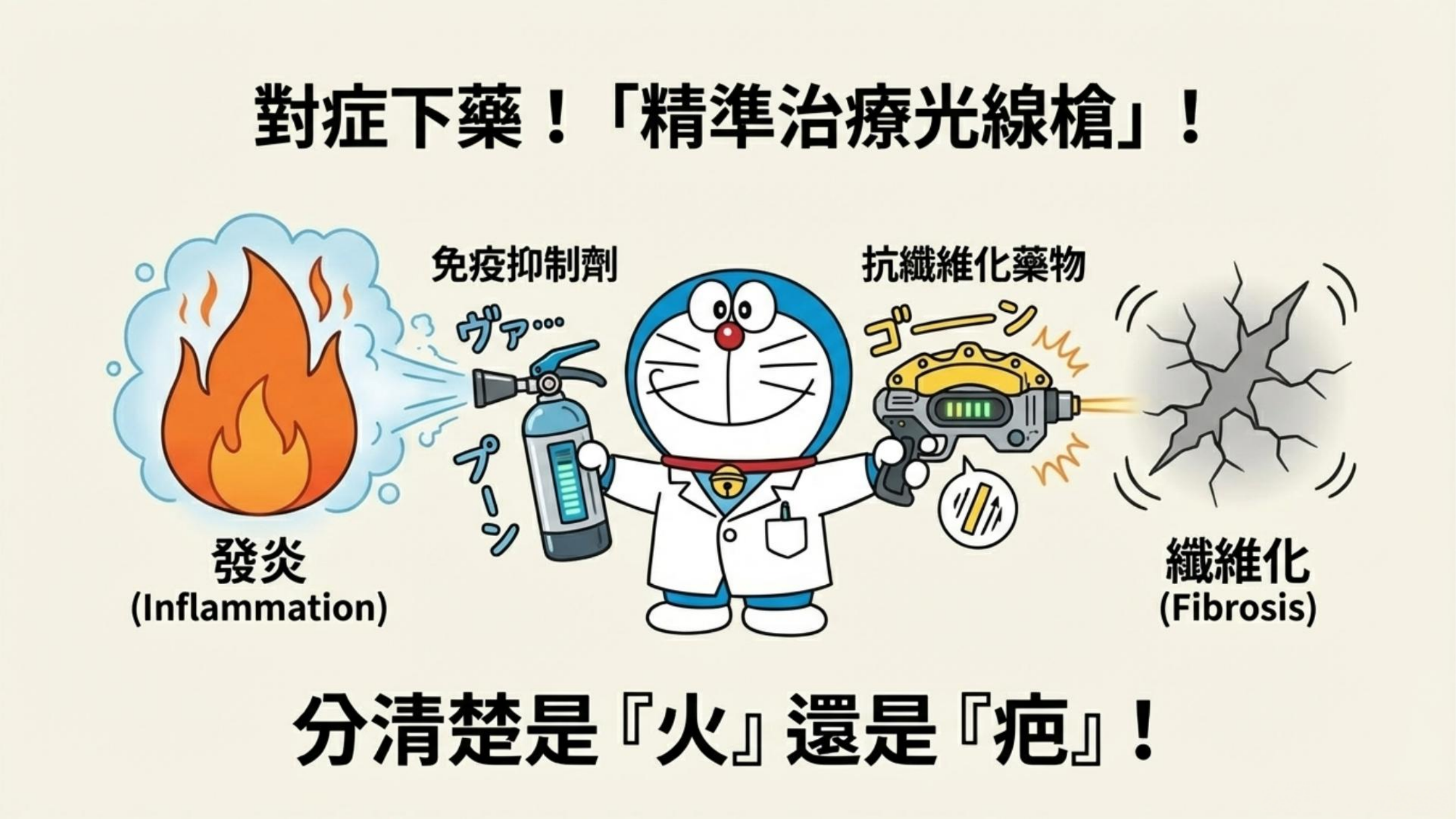 治療 ILD 的核心思維在於區分「發炎(Inflammation)」還是「纖維化(Fibrosis)」,這決定了完全不同的治療路徑。