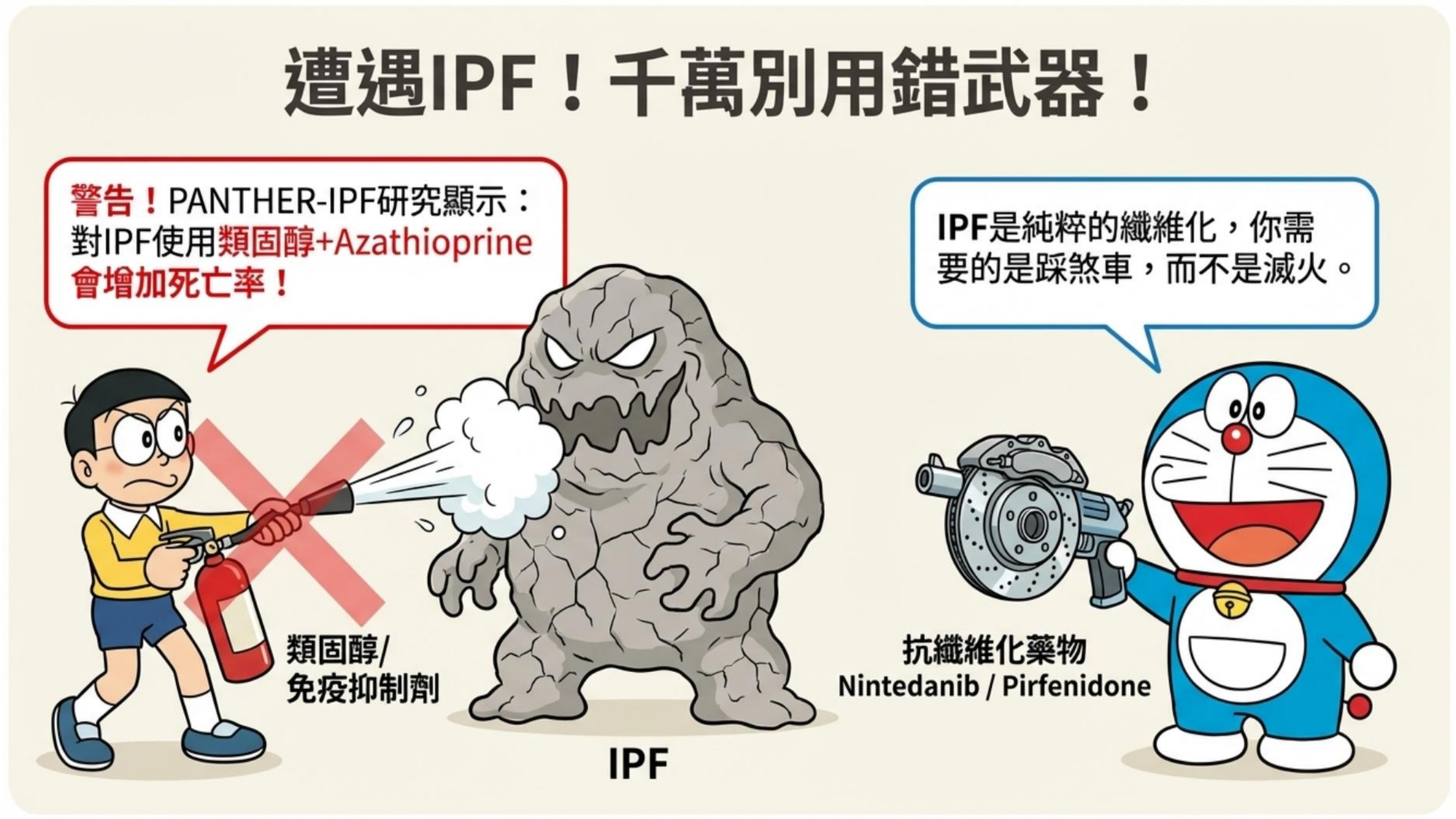 - 禁忌:(Slide S40) 在 IPF(純纖維化)病人身上使用類固醇或免疫抑制劑(如 Azathioprine),反而會增加死亡率。絕對不能「亂槍打鳥」。