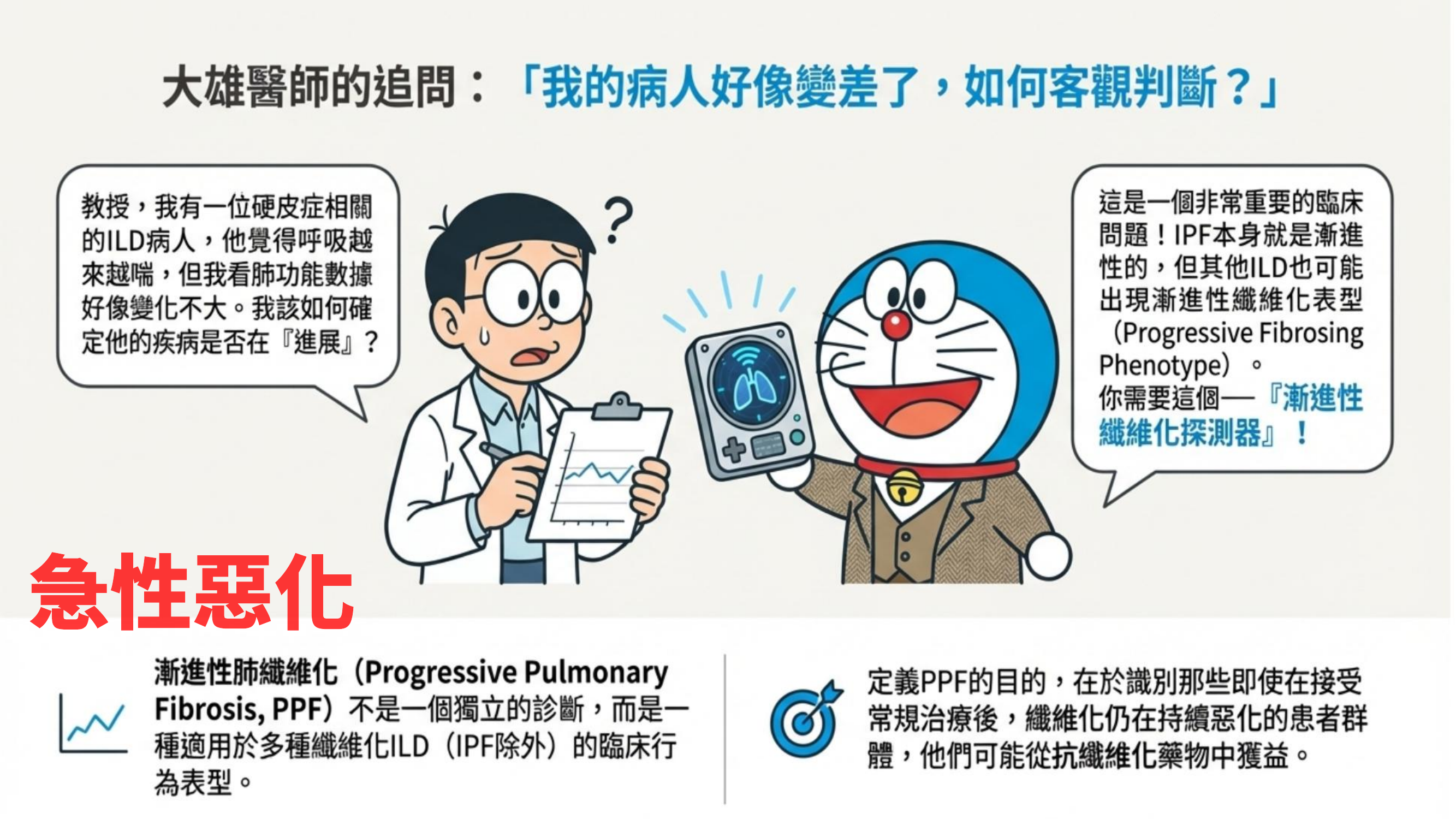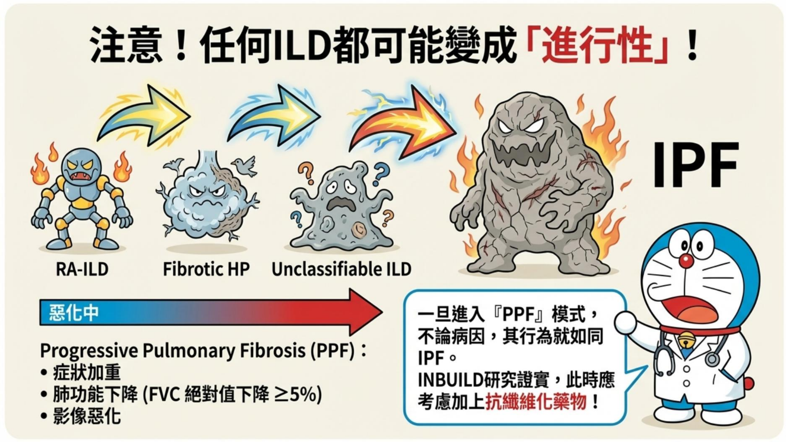 - 定義:PPF 不是單一疾病,而是任何 ILD(如 RA-ILD, HP, NSIP)在治療過程中,出現類似 IPF 的「進行性惡化」表型。