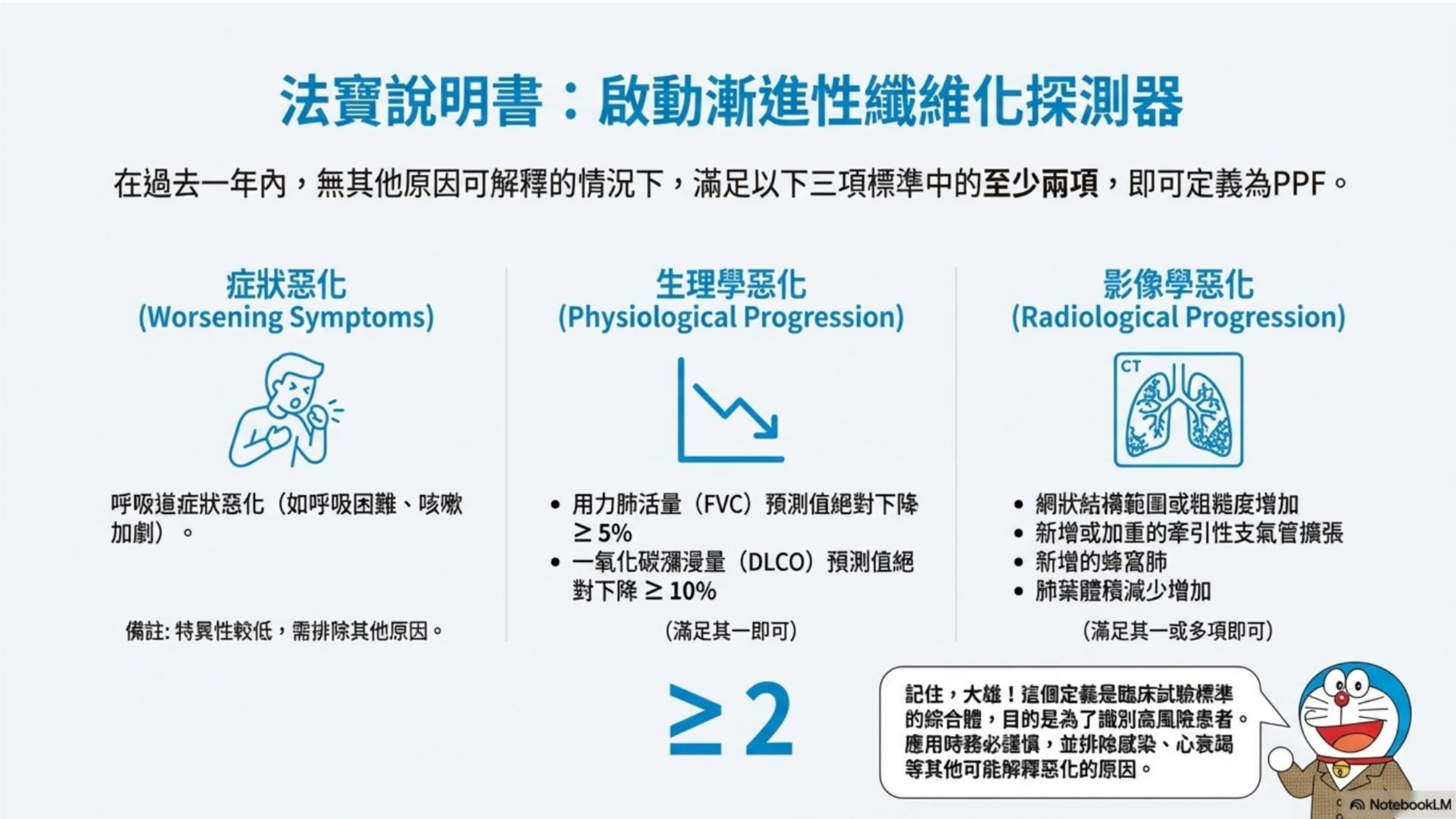 - 生理學惡化:FVC(用力肺活量)絕對值下降 ≥5% 或 DLCO(一氧化碳擴散能力)下降 ≥10%。