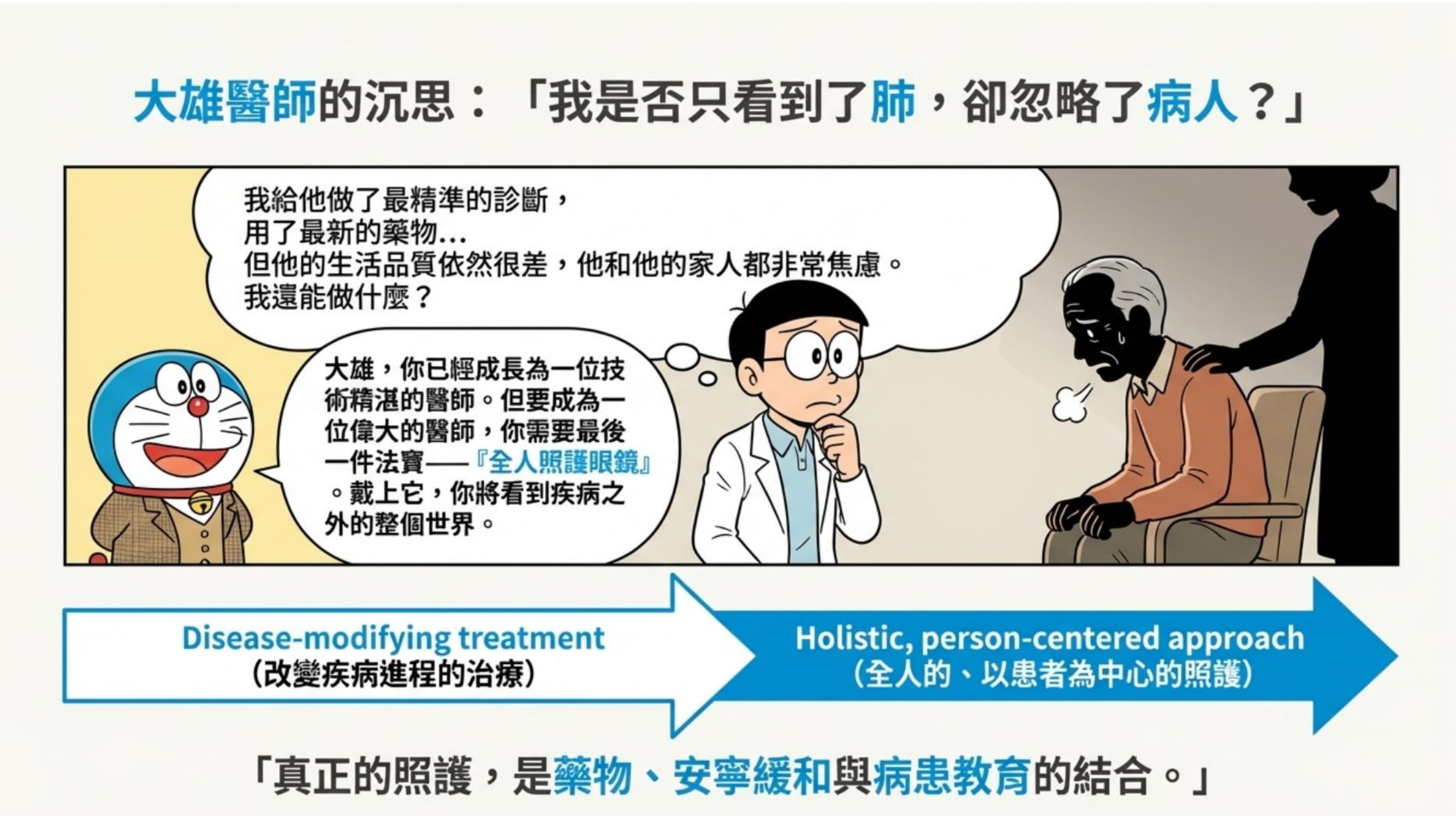 - 病患困境:病人常覺得「藥越吃越差」(因為肺功能仍會持續下降,只是斜率變平緩),導致治療順從性低與心理挫折。