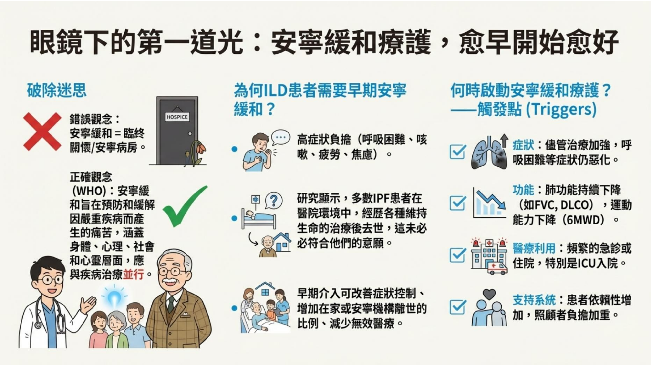 - 觀念導正:安寧不等於臨終(Hospice),而是從診斷早期就介入的症狀控制。