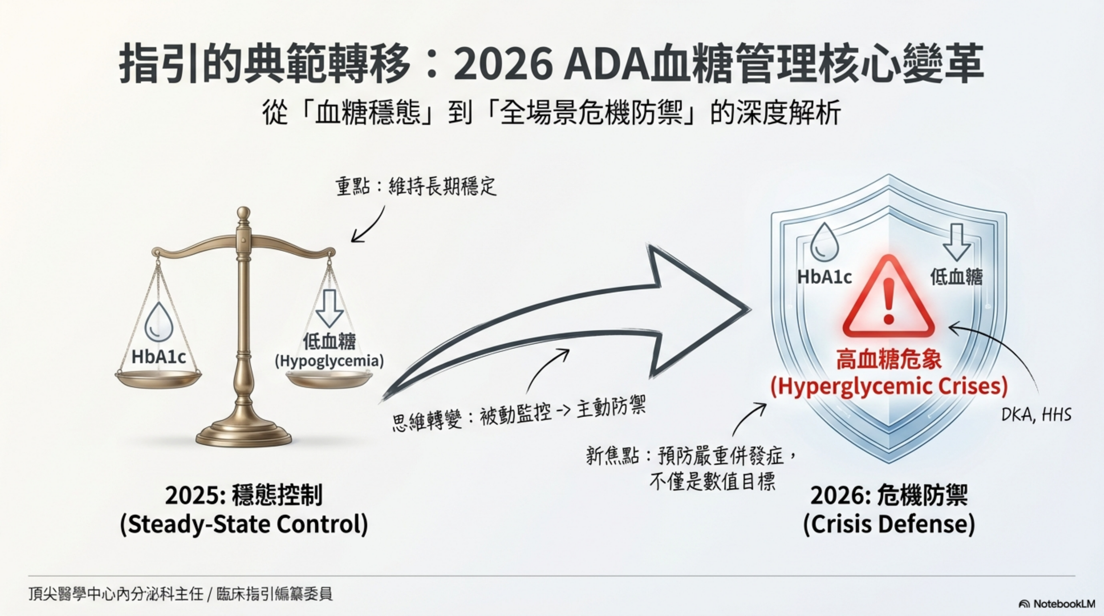 2025 年版的核心哲學在於平衡 HbA1c 達標與低血糖預防。2026 年版發生了結構性的哲學轉移,將「高血糖急症 (Hyperglycemic Crises)」的預防地位大幅提升,使其從傳統的住院章節(Section 16)前推至門診常規照護。