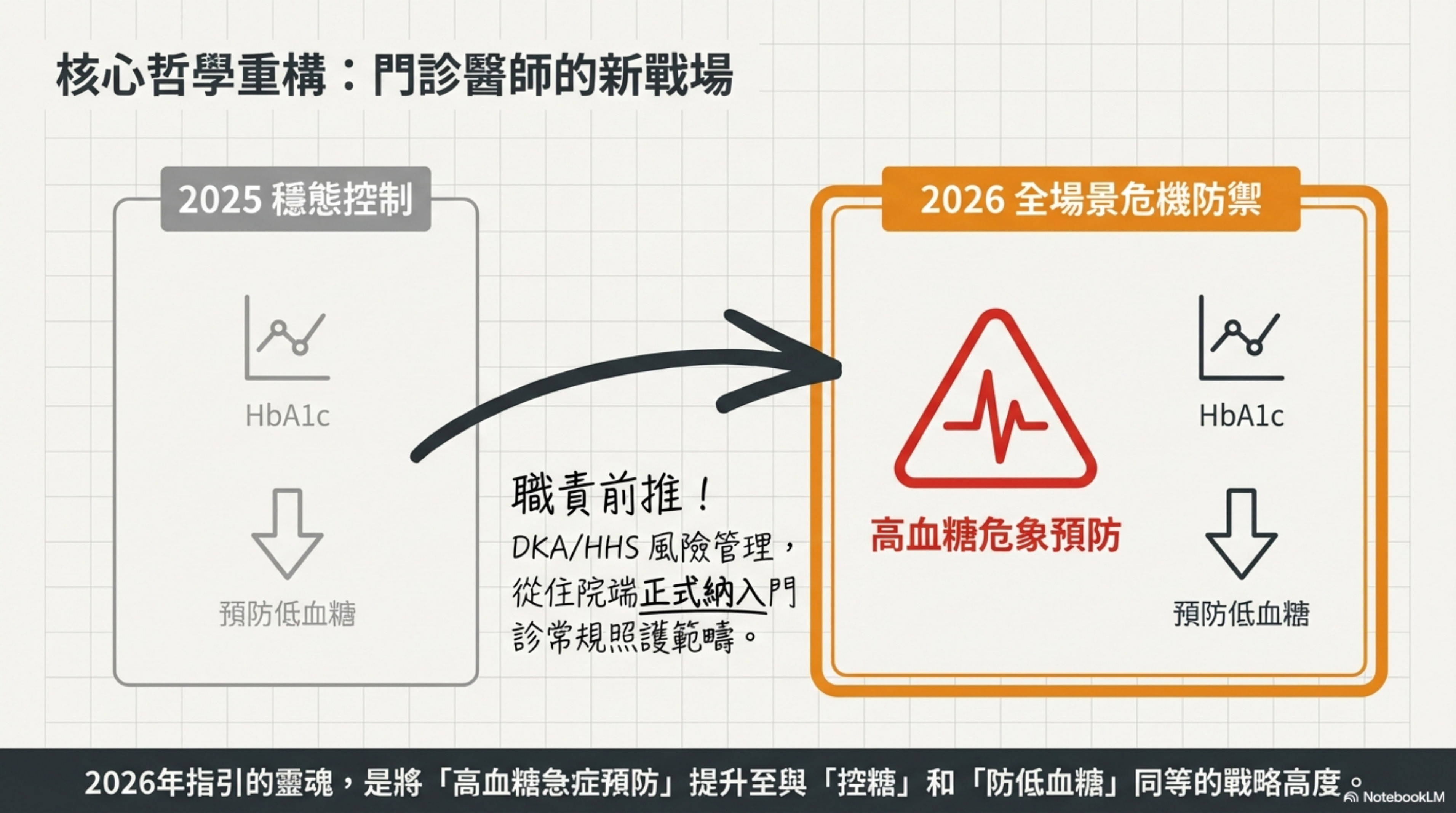 - 去強化治療 (Deintensification) 的實證支持: 引用 Grant RW et al. (JAMA Intern Med 2025) 的隨機臨床試驗,證實了在高齡族群簡化治療的安全性,這直接支持了低血糖風險評估的證據等級升級(Grade E B)。