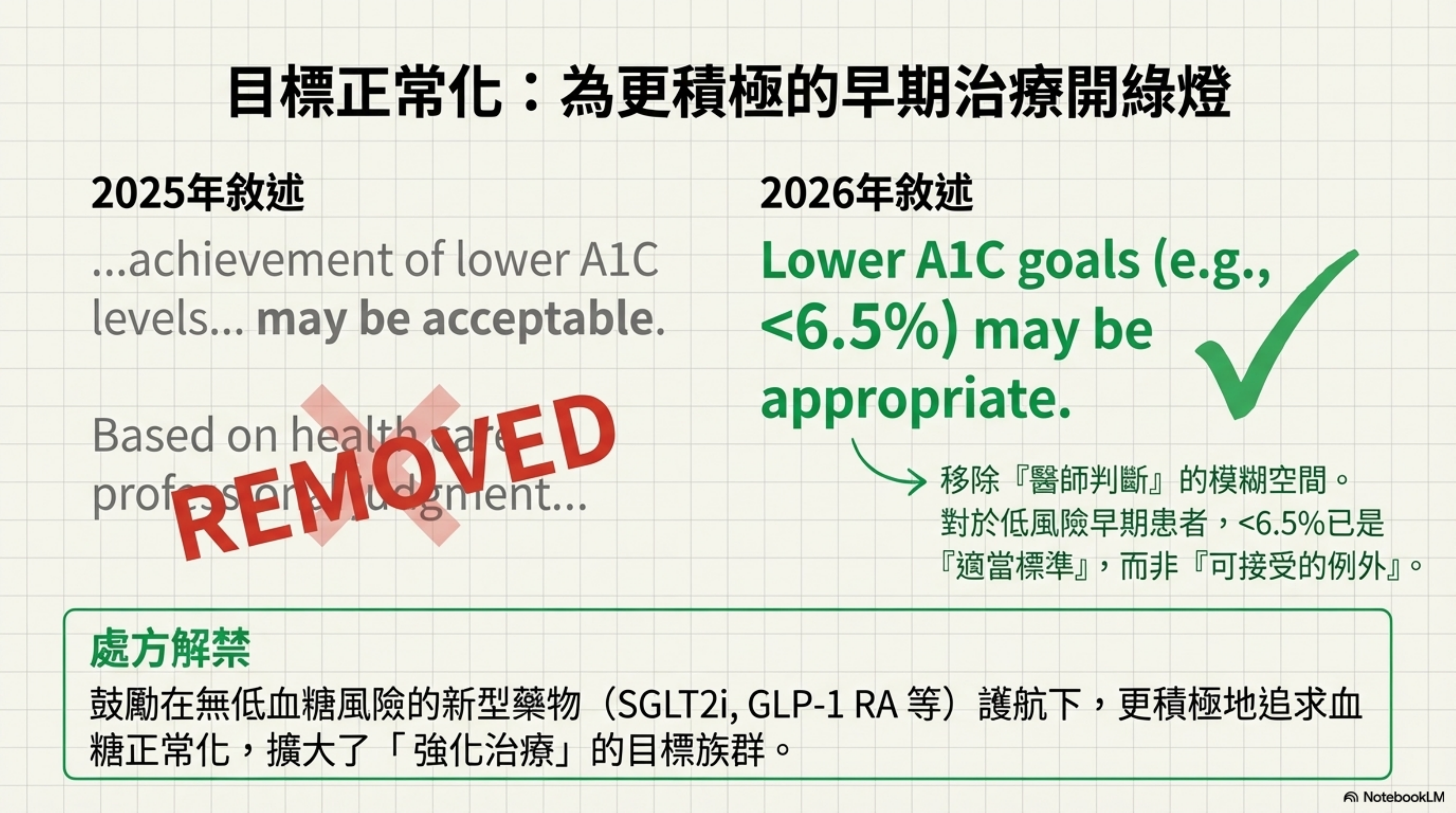 - 將 <6.5% 直接寫入 Recommendation Text 中,這將擴大「強化治療」的目標族群,使其涵蓋所有使用非低血糖風險藥物(Metformin, SGLT2i, GLP-1/GIP RA)的早期病患。