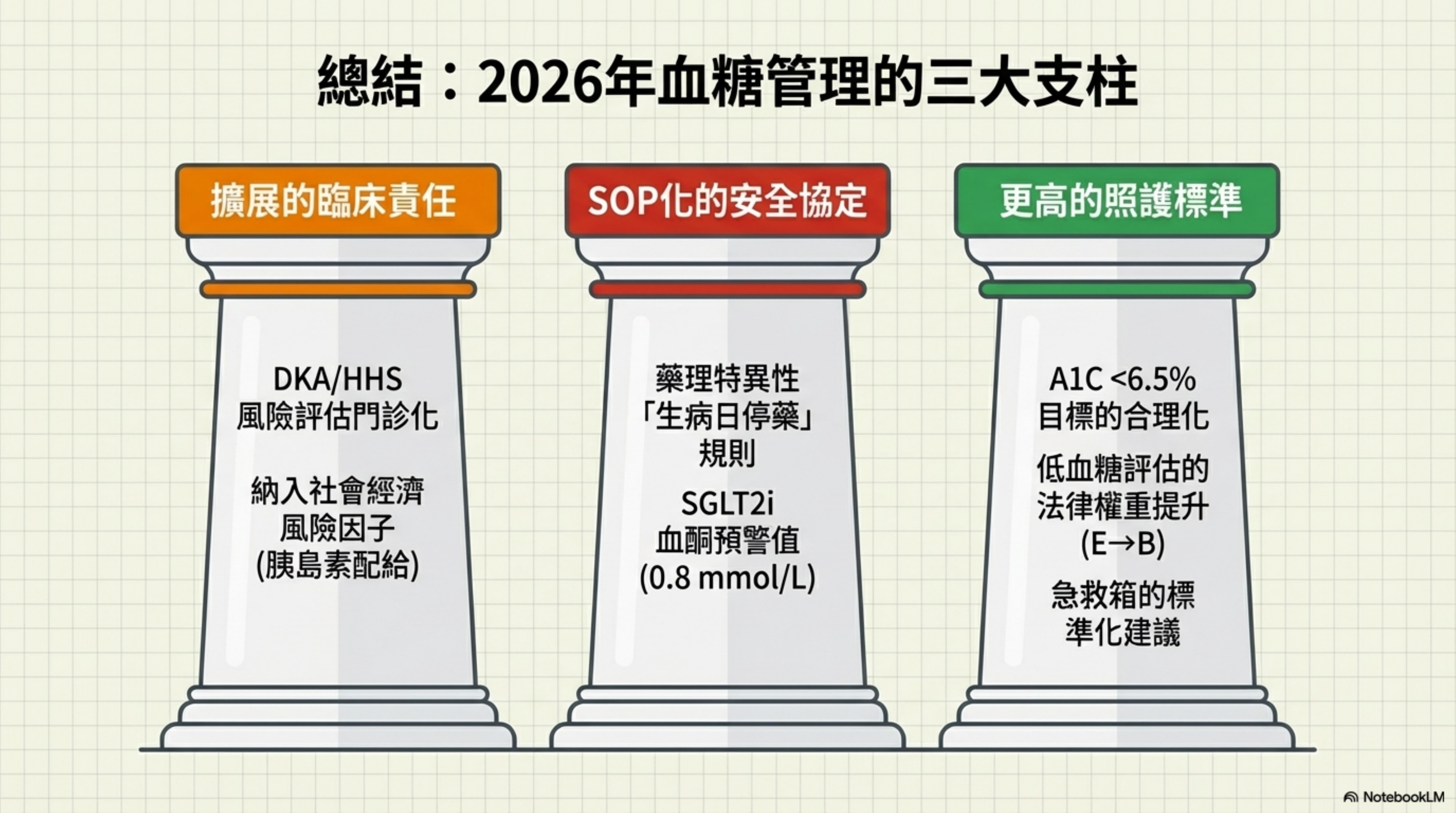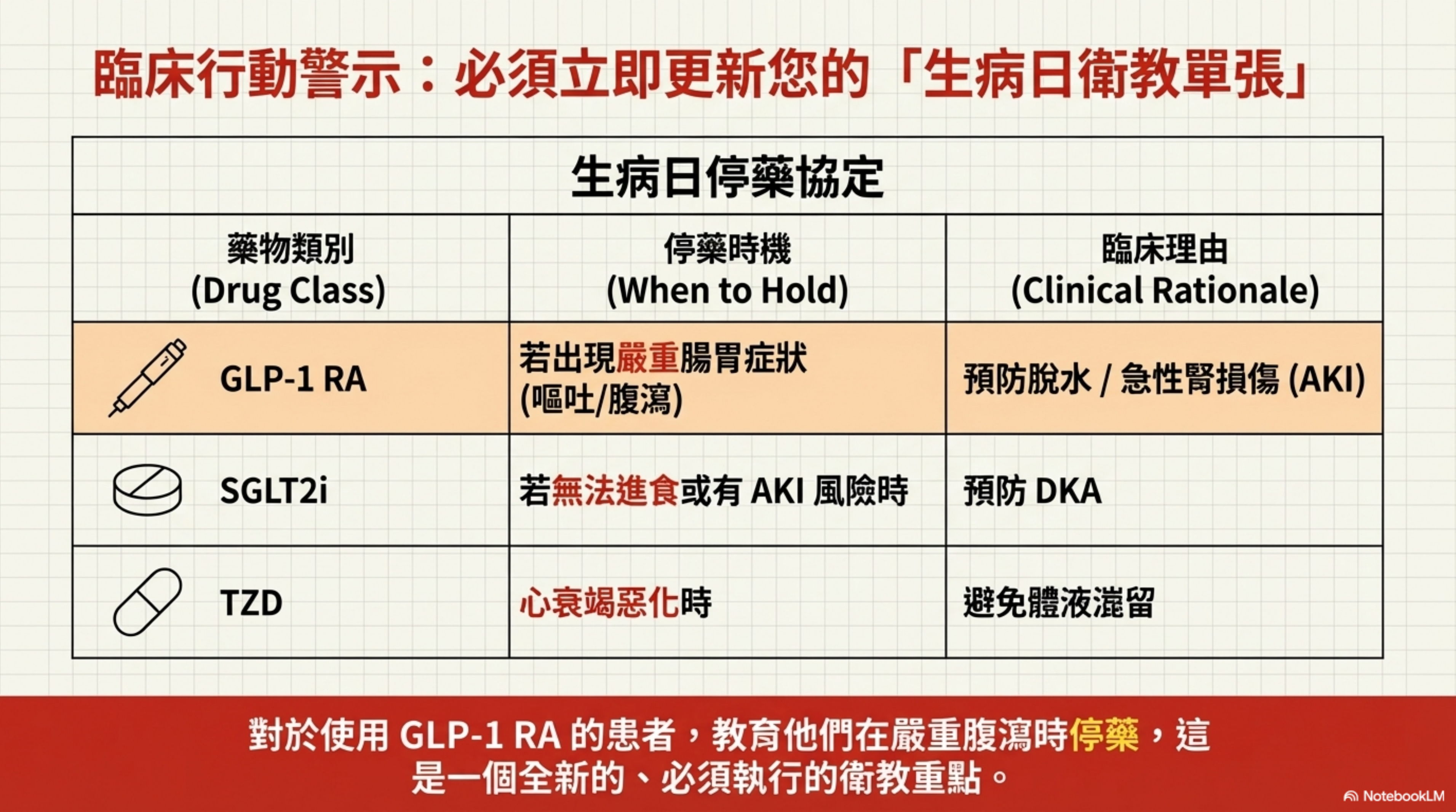 - GLP-1 RA 從單純的「降糖藥」被重新定義為「生病日需管理的風險藥物」。新指引承認其腸胃道副作用在急性病程中可能加重脫水,因此將其納入 Sick Day Protocol 的停藥清單。