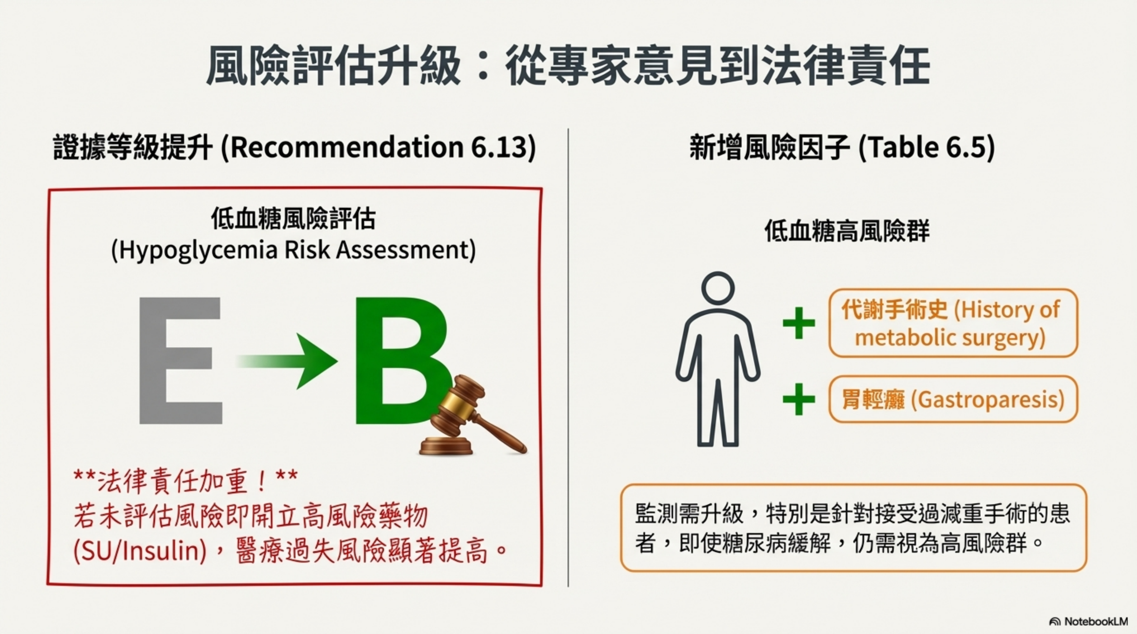 | 低血糖風險評估 (Rec 6.13) | Clinicians should consider... (Grade E) | Consider an individual's risk... (Grade B) | 證據等級升級 | 法律責任加重:從「專家意見」升級為「臨床實證支持」。若醫師未評估風險即開立高風險藥物(如 SU/Insulin),其醫療過失的法律責任將更難推卸。 |