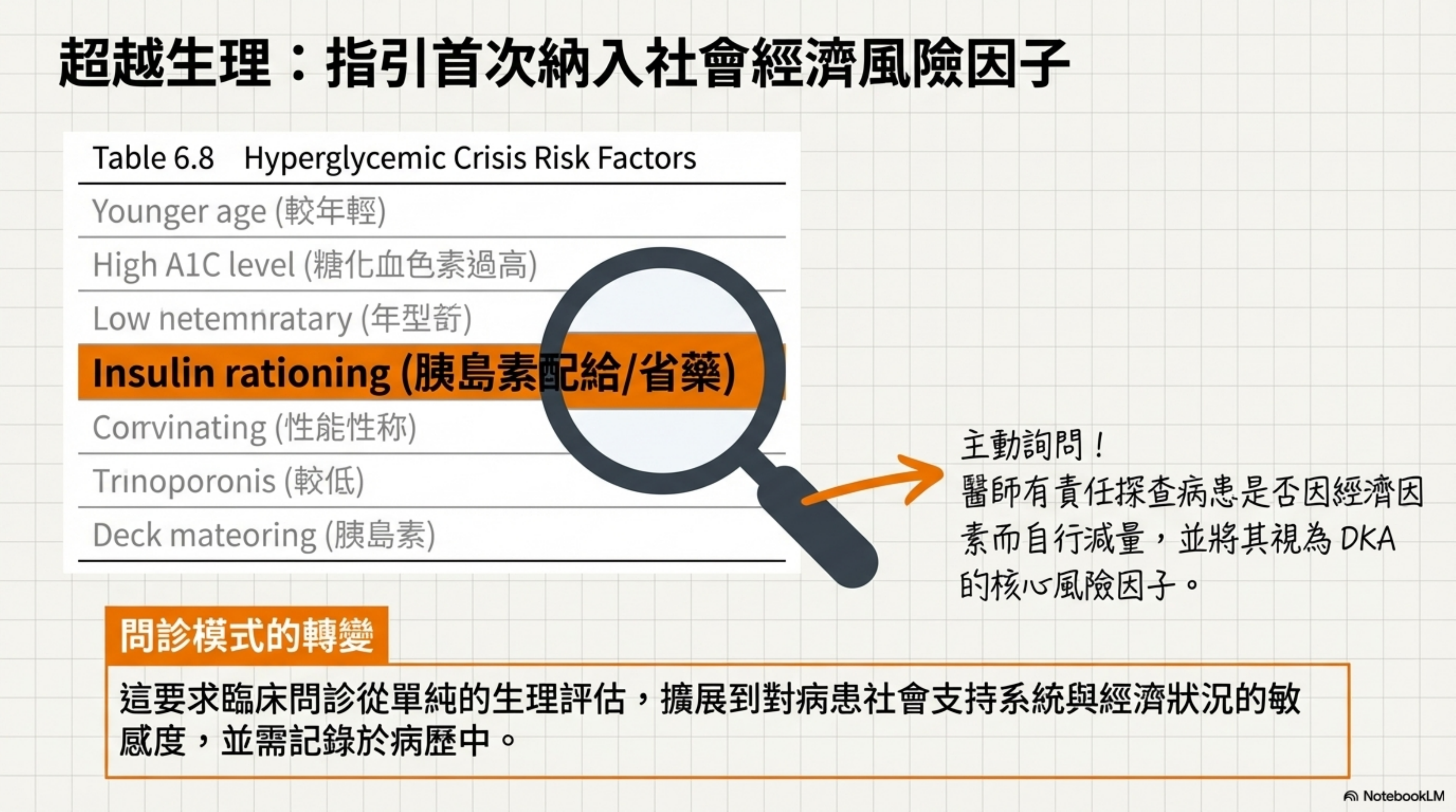 | 高血糖危象風險 (Table 6.8) | 列出 SDOH (社會決定因素)。 | 新增 "Insulin rationing" (胰島素配給/省藥)。 | 新增風險源 | 要求醫師主動詢問病患是否因經濟因素而「減少胰島素用量」,並將其視為 DKA 的核心風險因子。 |