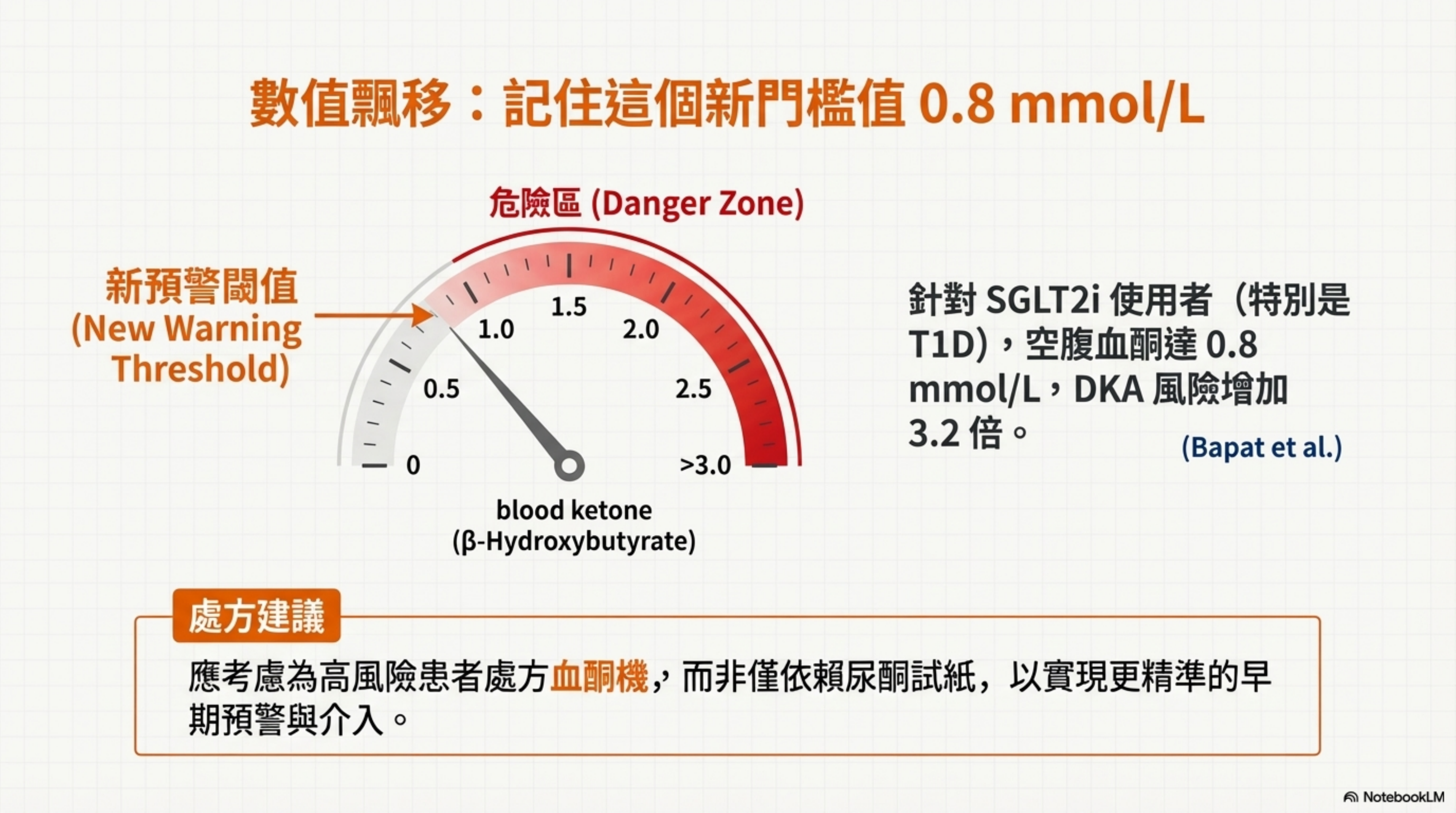 - 新標準: 針對 SGLT2i 使用者,新版確立了 0.8 mmol/L 為「危險紅區」(風險增加 3.2 倍)。