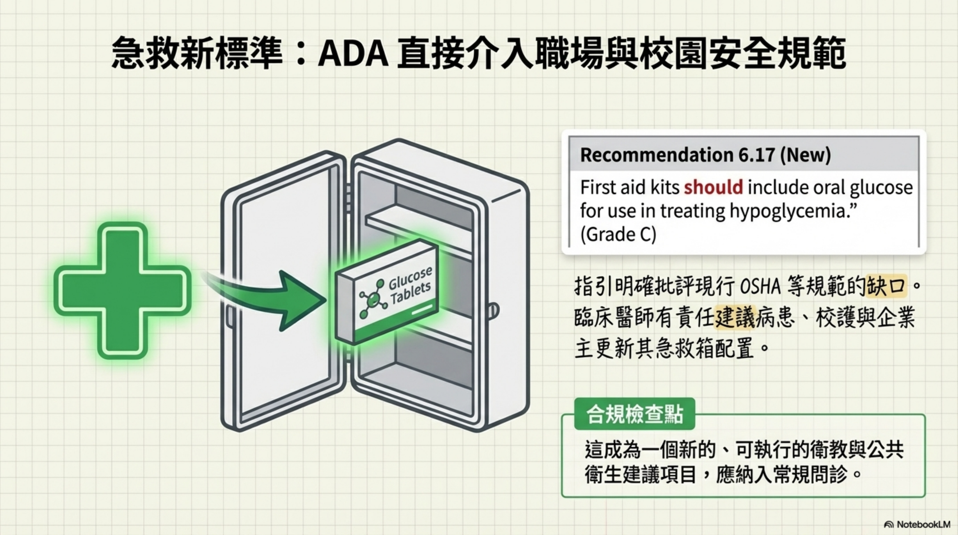 | 低血糖急救包 (Rec 6.17) | (未提及具體配置) | Rec 6.17 (New): First aid kits should include oral glucose... (Grade C) | 新增建議 | 合規檢查:臨床醫師應建議學校、企業主或病患檢查其職場急救箱。指引明確批評現行急救規範遺漏葡萄糖的缺失。 |