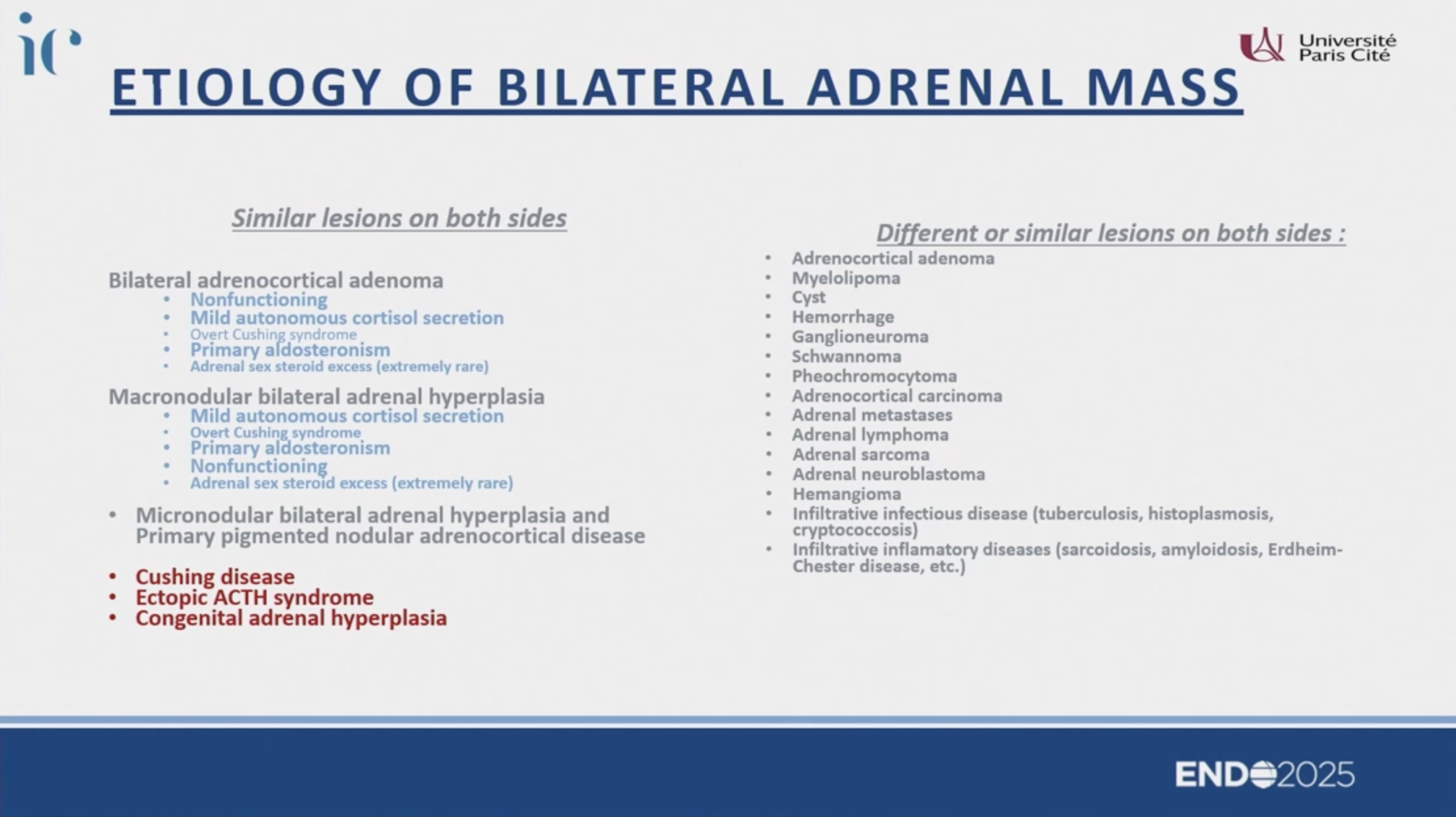 - 手術考量: 雖然有雙側腫塊,但若無明顯庫欣氏症候群(Overt Cushing),不建議直接進行雙側腎上腺切除。