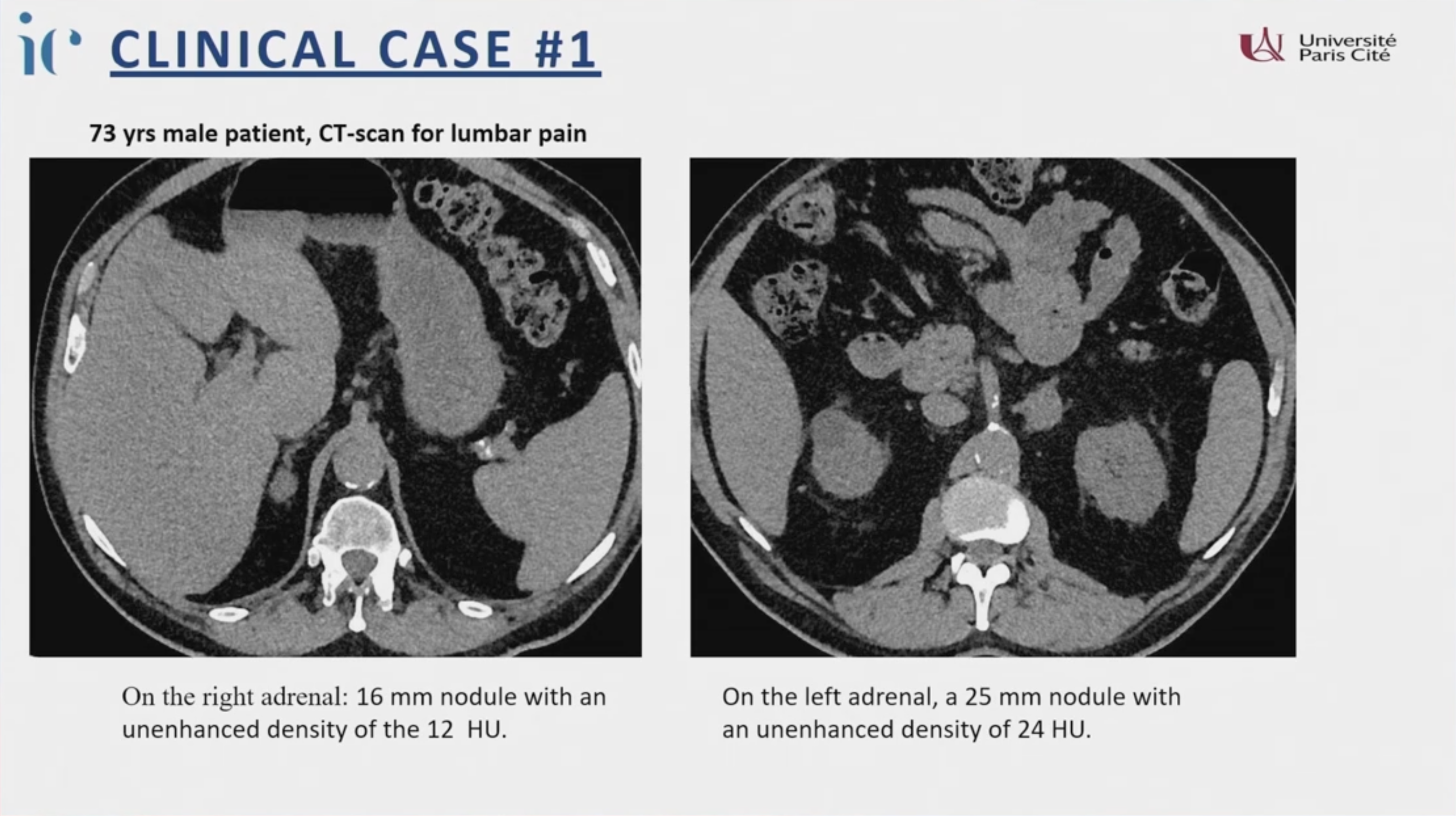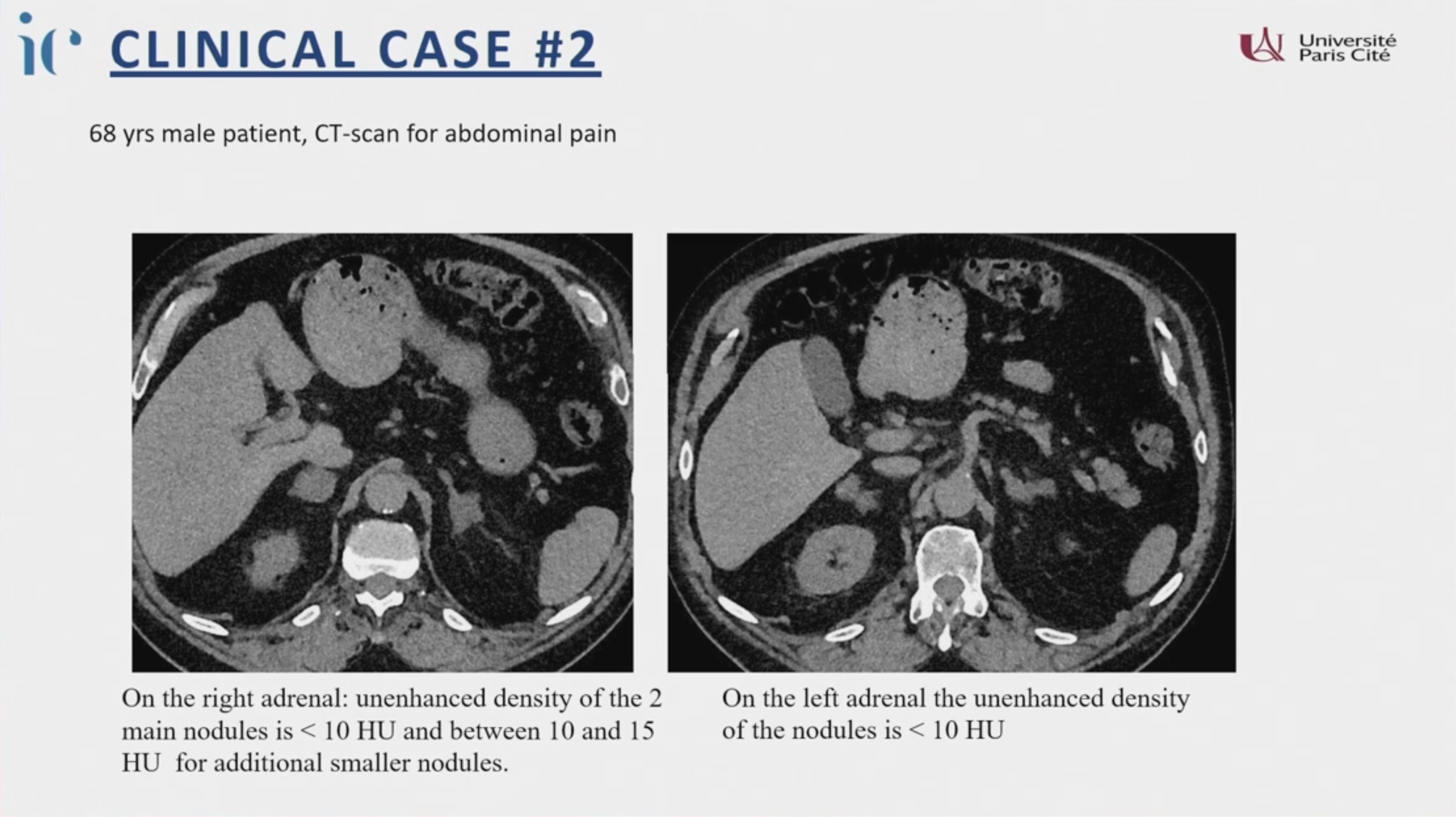 - 密度 < 10 HU(Hounsfield Unit)且均質: 無論大小,幾乎可確定為良性腎上腺皮質病變(Benign adrenocortical lesion)。