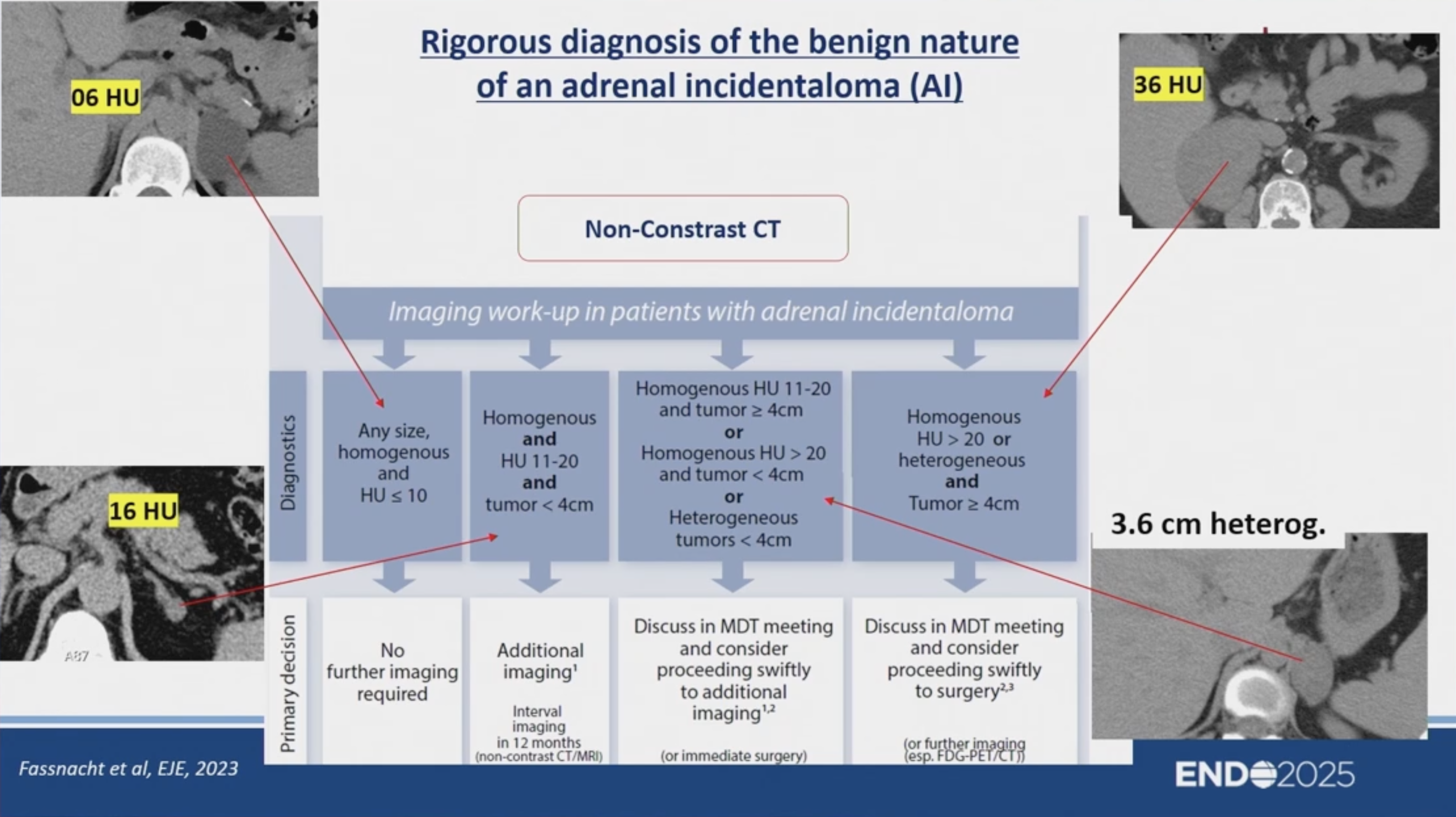 - 密度 > 20 HU 或 不均質 或 大於 4cm: 需高度懷疑惡性或非腺瘤病變(如嗜鉻細胞瘤、轉移癌)。需進入多專科團隊(MDT)討論,考慮進一步影像檢查(如 PET)或手術。