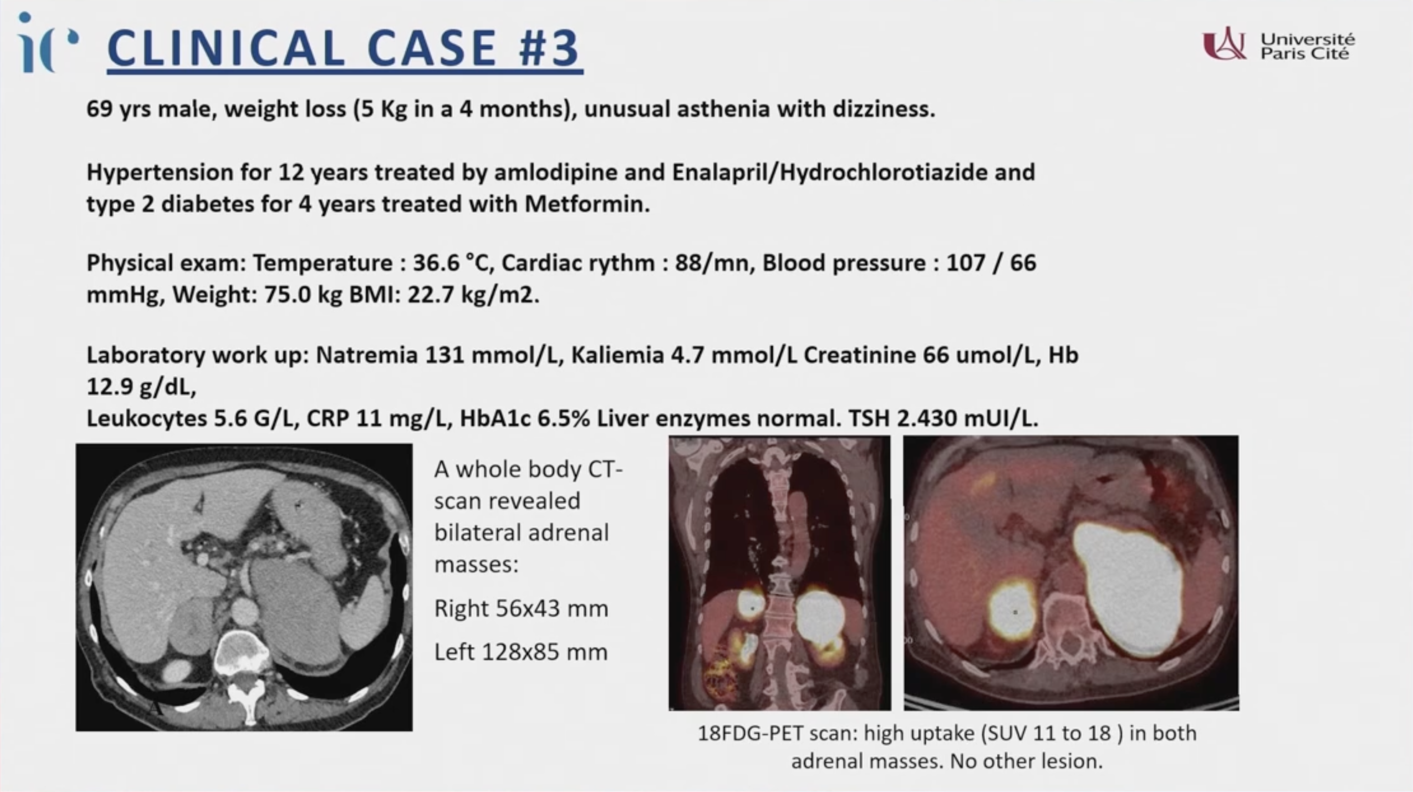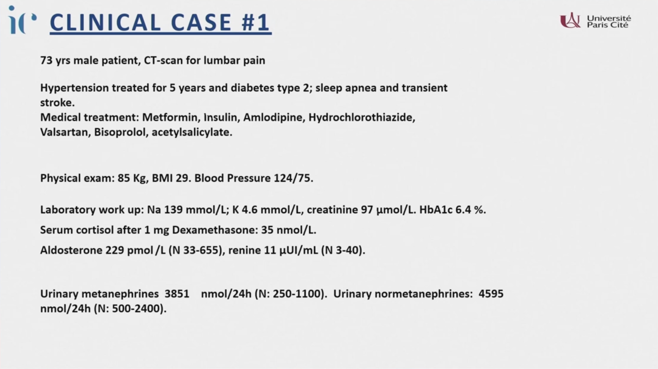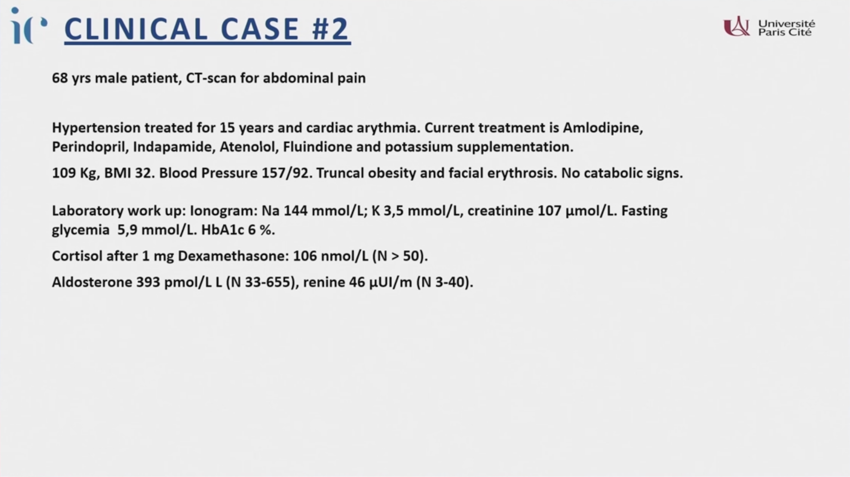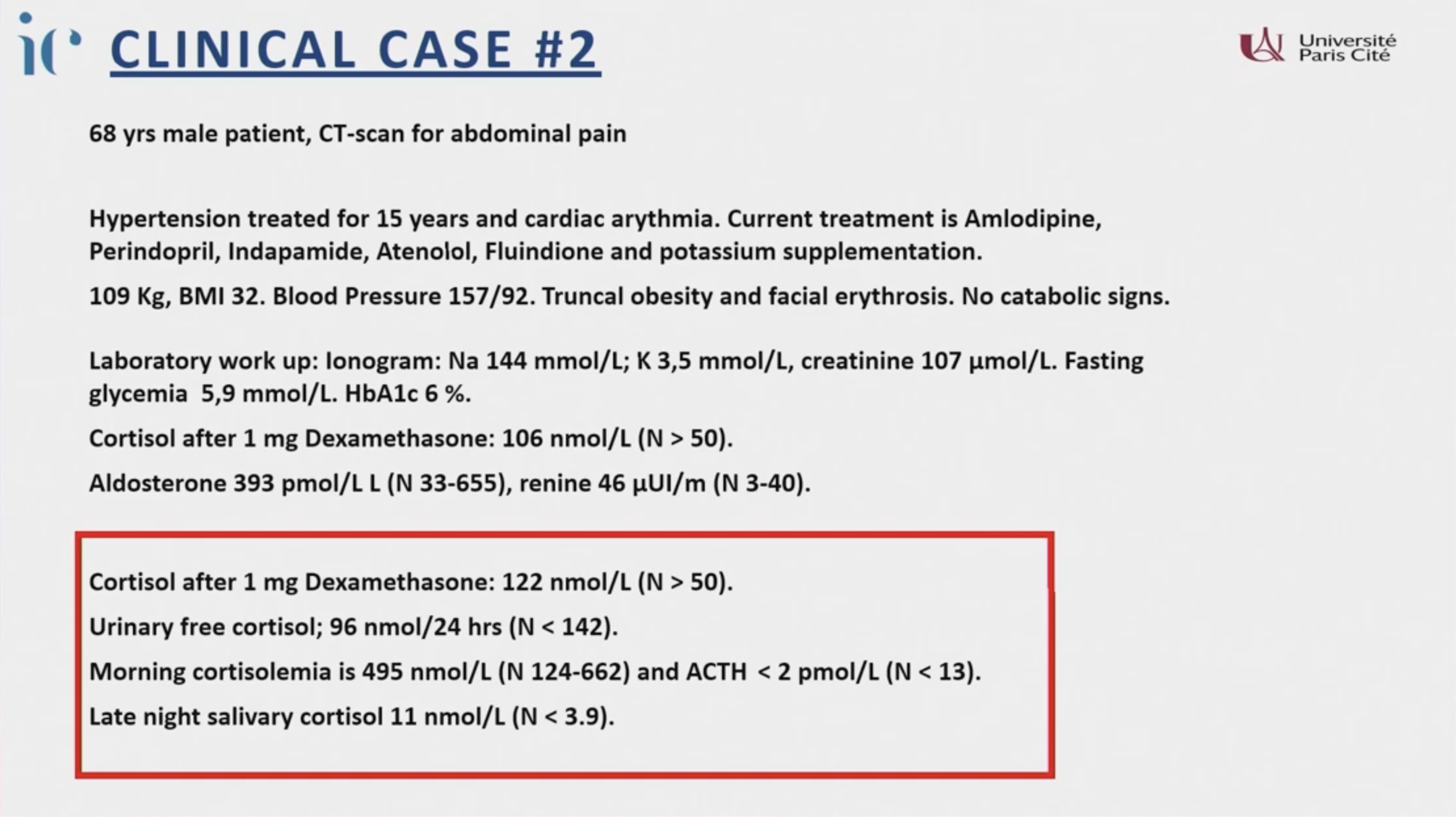 - 臨床共病: 高血壓(15 年,使用 5 種藥物仍控制不佳)、低血鉀(需補充鉀)、向心性肥胖、面部潮紅。BMI 32,血壓 157/92 mmHg。