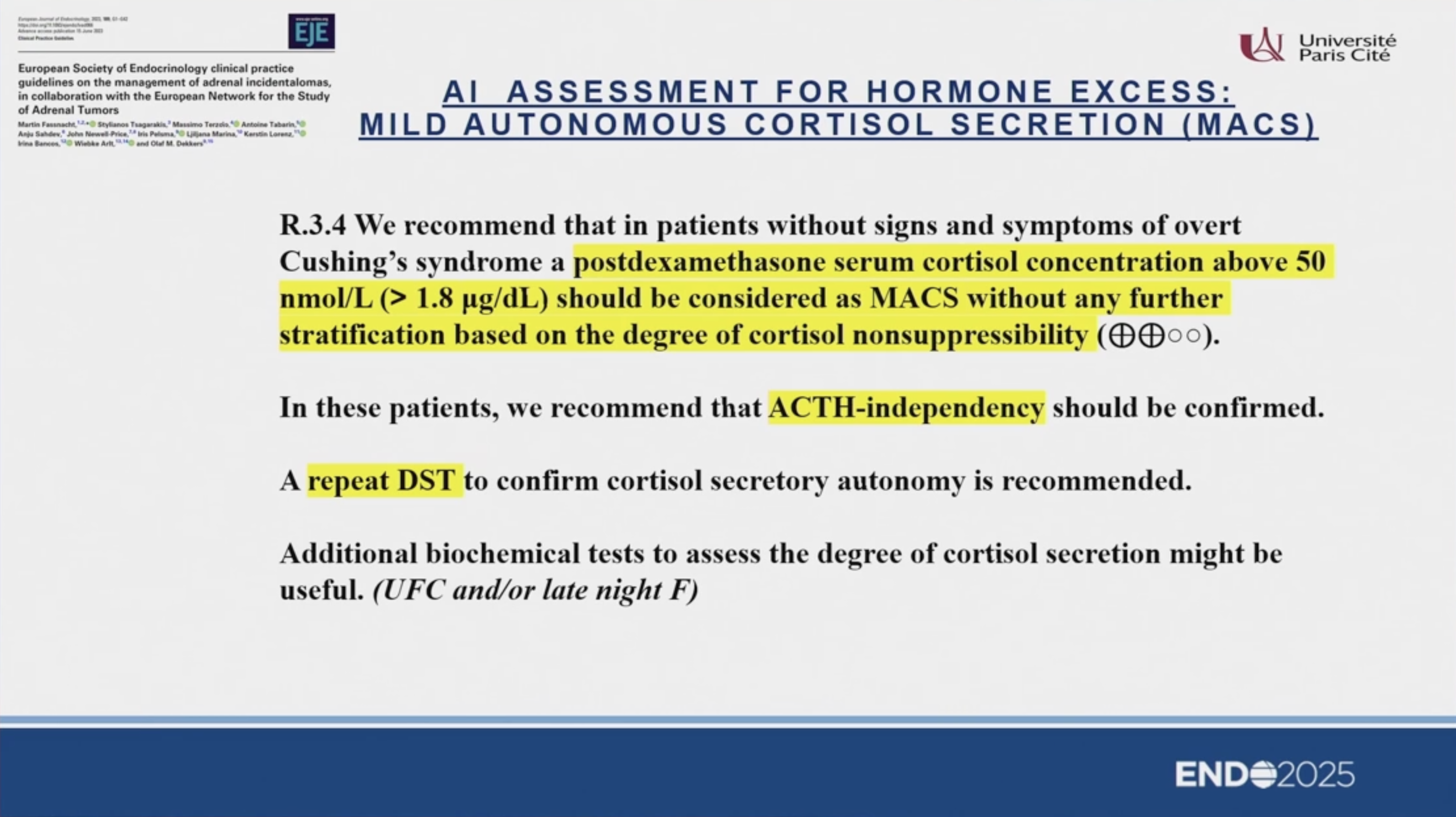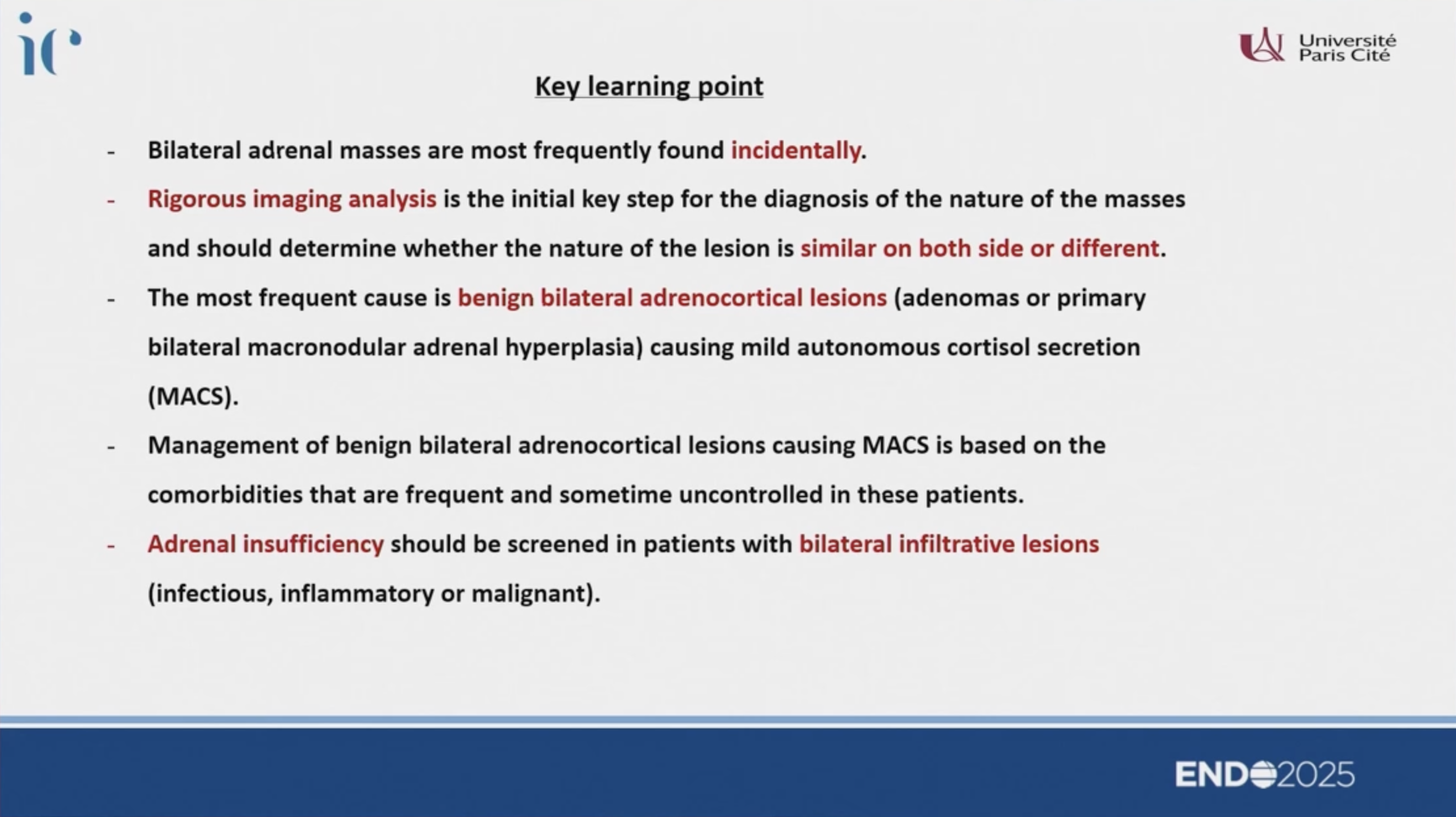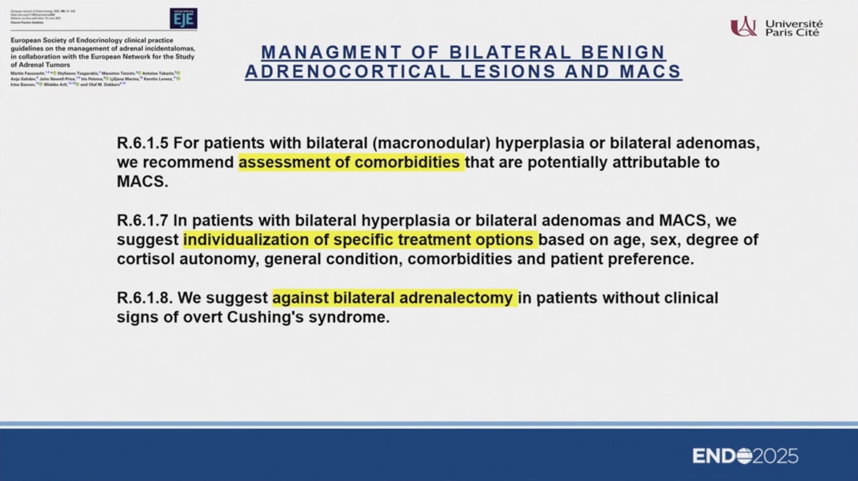 - MACS 的管理: 需根據共病(高血壓、糖尿病、骨質疏鬆)及皮質醇分泌程度決定。雙側病變的 MACS 通常比單側病變造成更嚴重的共病。