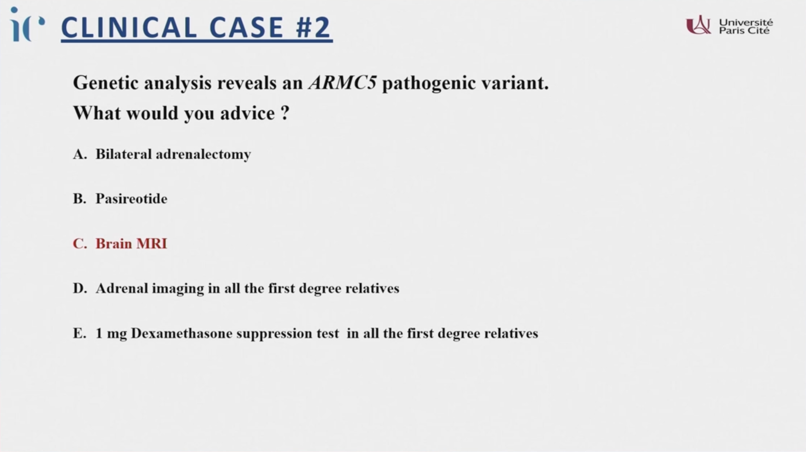 - 腦部 MRI: 強烈建議。研究顯示 ARMC5 突變與腦膜瘤(Meningioma)有關。若發現腦膜瘤,需避免使用黃體酮(Progesterone)類藥物。