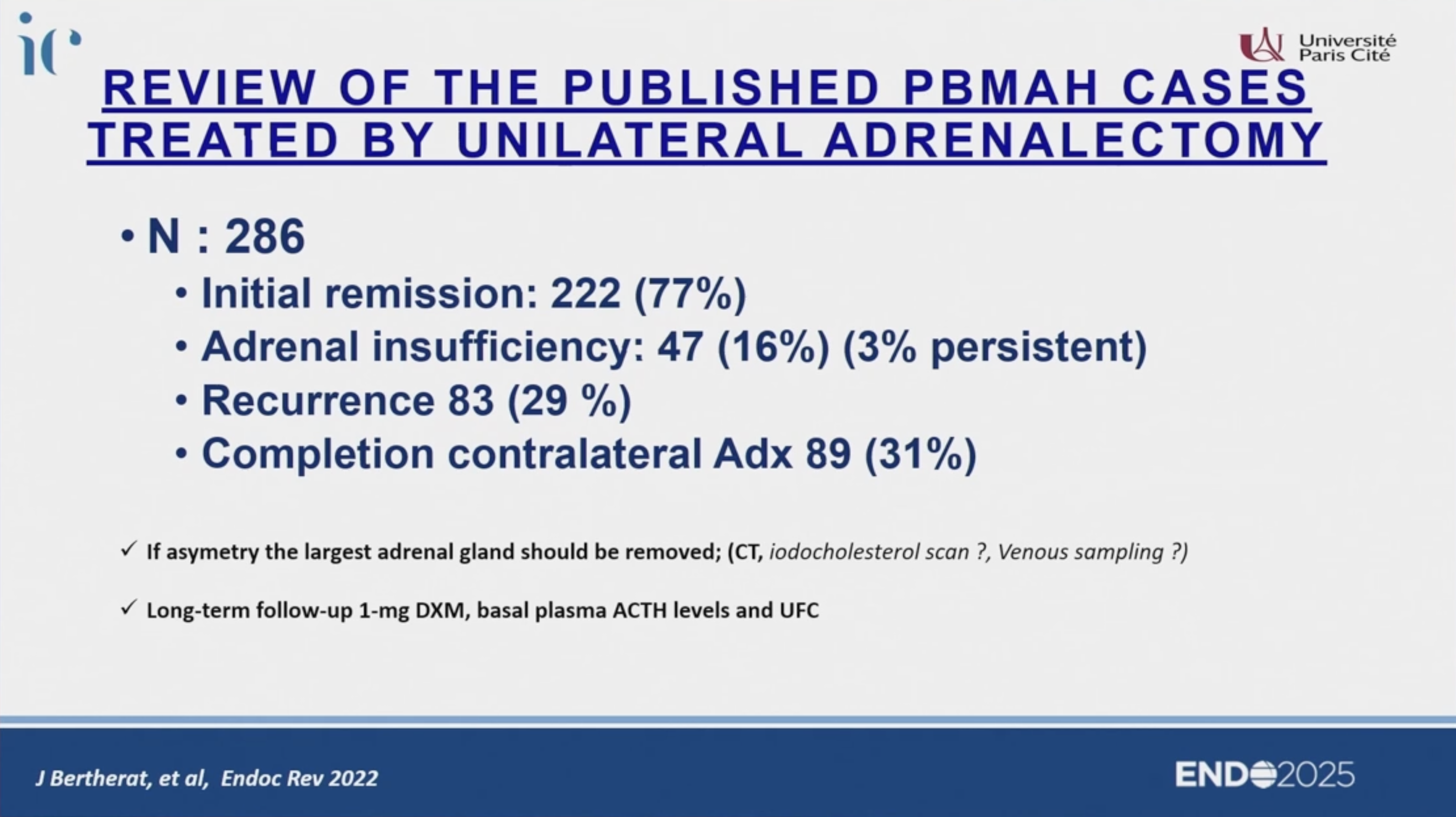 - 長期追蹤: 雖然 77% 初步緩解,但因為保留的對側腎上腺仍有基因缺陷/病變基礎,29% 的復發率提示需終身監測(每年測量 1mg DST, ACTH, UFC)。