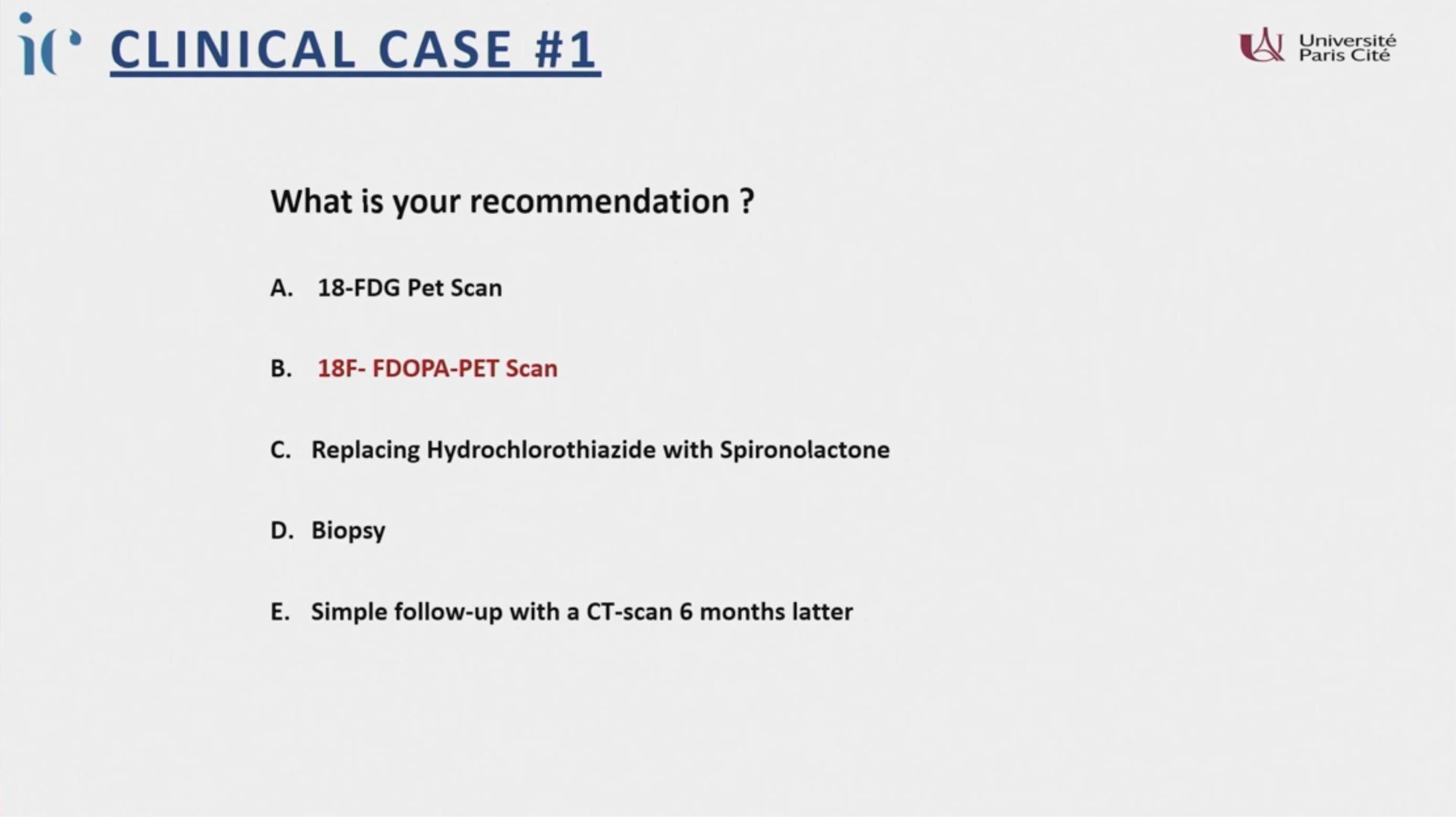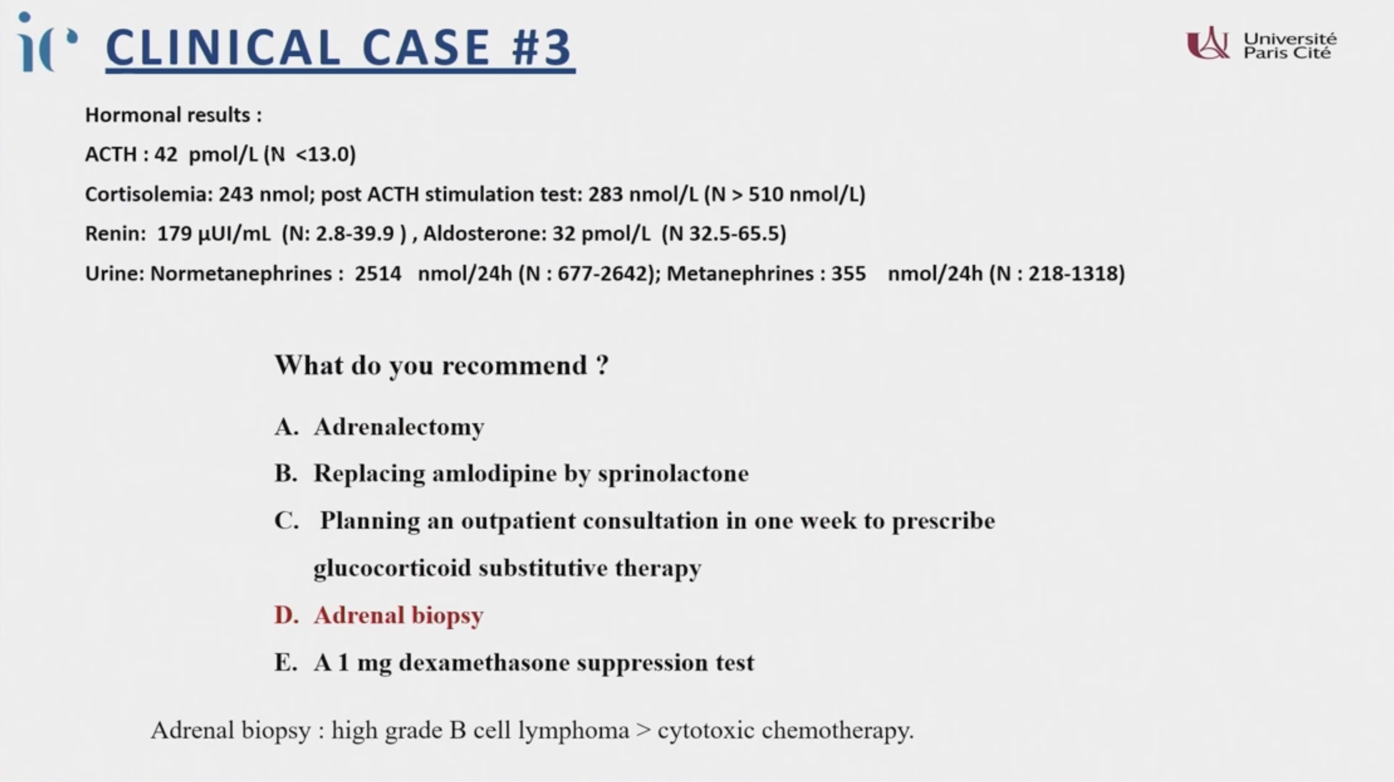 - 建議進行尿液類固醇代謝物檢查(Urine steroid metabolomics)或考慮其他影像(MRI, PET)。