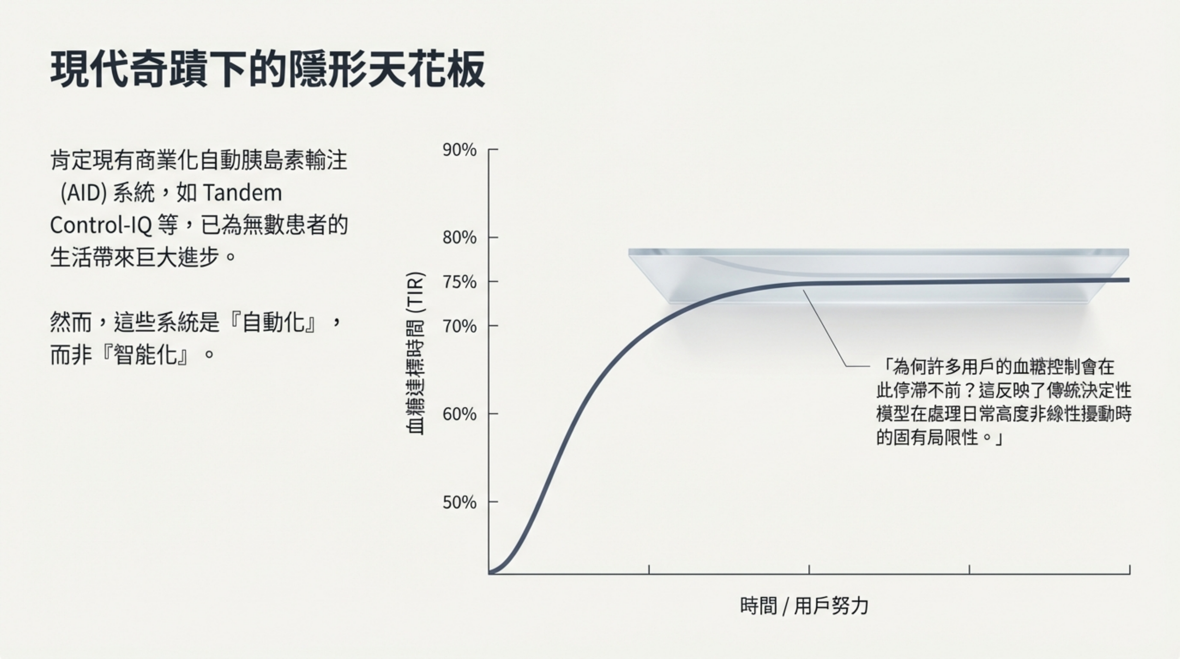 說明: 目前的商業化 AID 系統(如 Tandem Control-IQ)雖然極大改善了患者生活,但它們主要依賴決定性控制模型 。