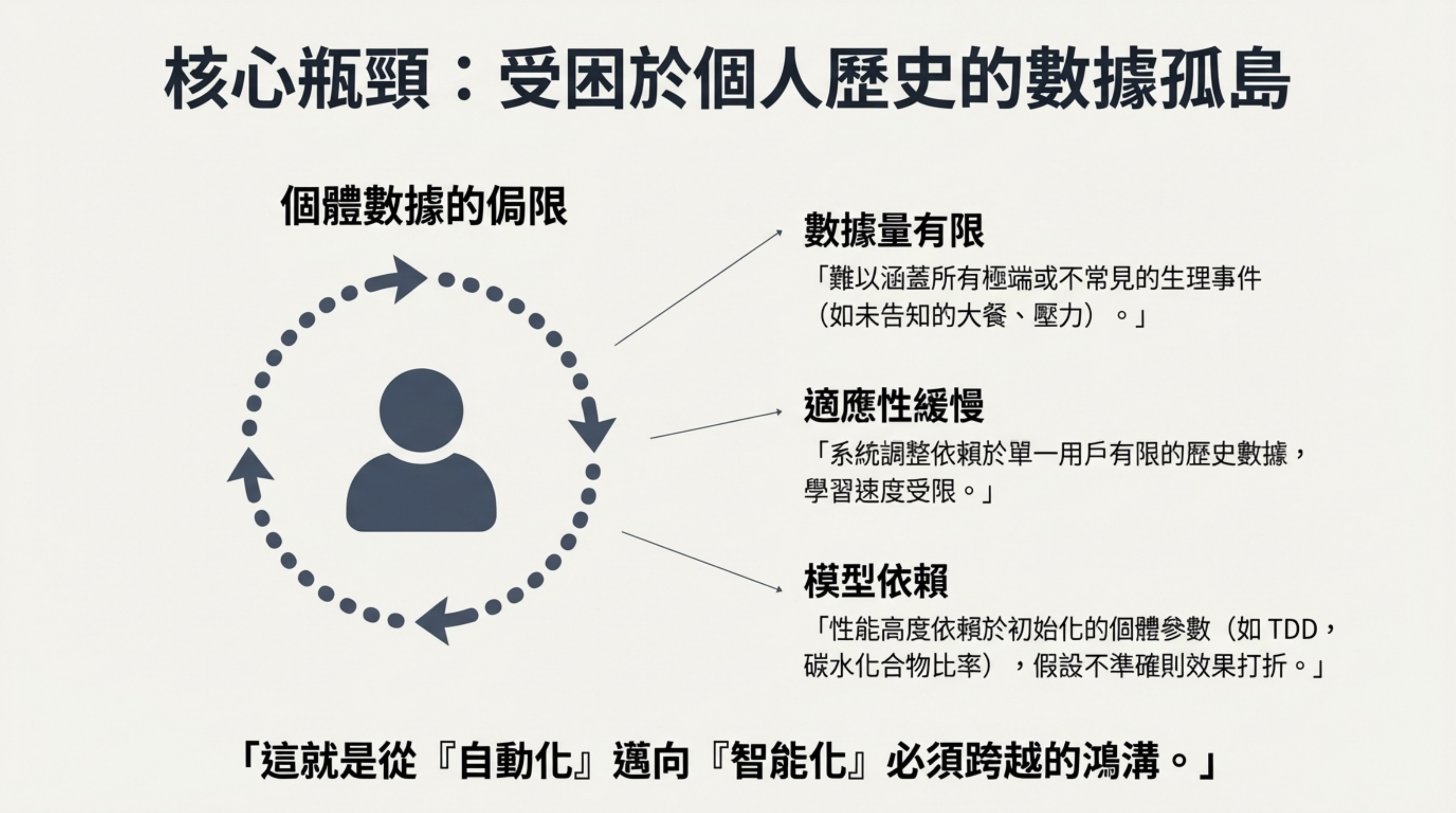 數據量有限: 單一患者的歷史數據難以涵蓋所有極端或不常見的生理事件(如偶發的暴飲暴食),導致模型在面對新情況時魯棒性不足 。