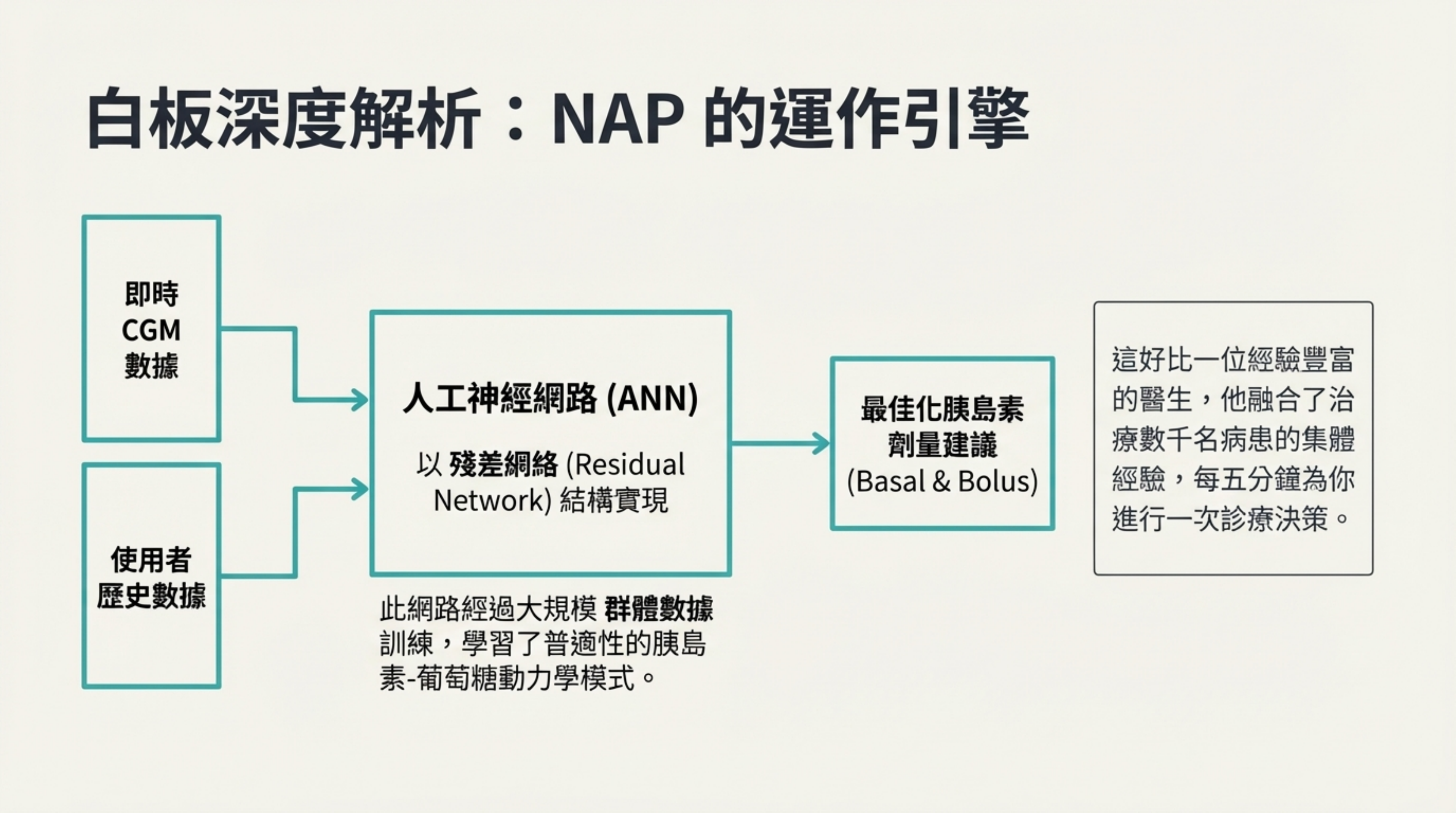非參數化模式識別: 系統利用數千名用戶的歷史記錄訓練決策模型,捕捉廣泛的胰島素反應曲線。這使得 NAP 即使面對單一患者未曾遇過的極端狀況,也能借鑑群體經驗做出穩健決策 。這標誌著從「基於假設」過渡到「基於大數據經驗」的時代 。