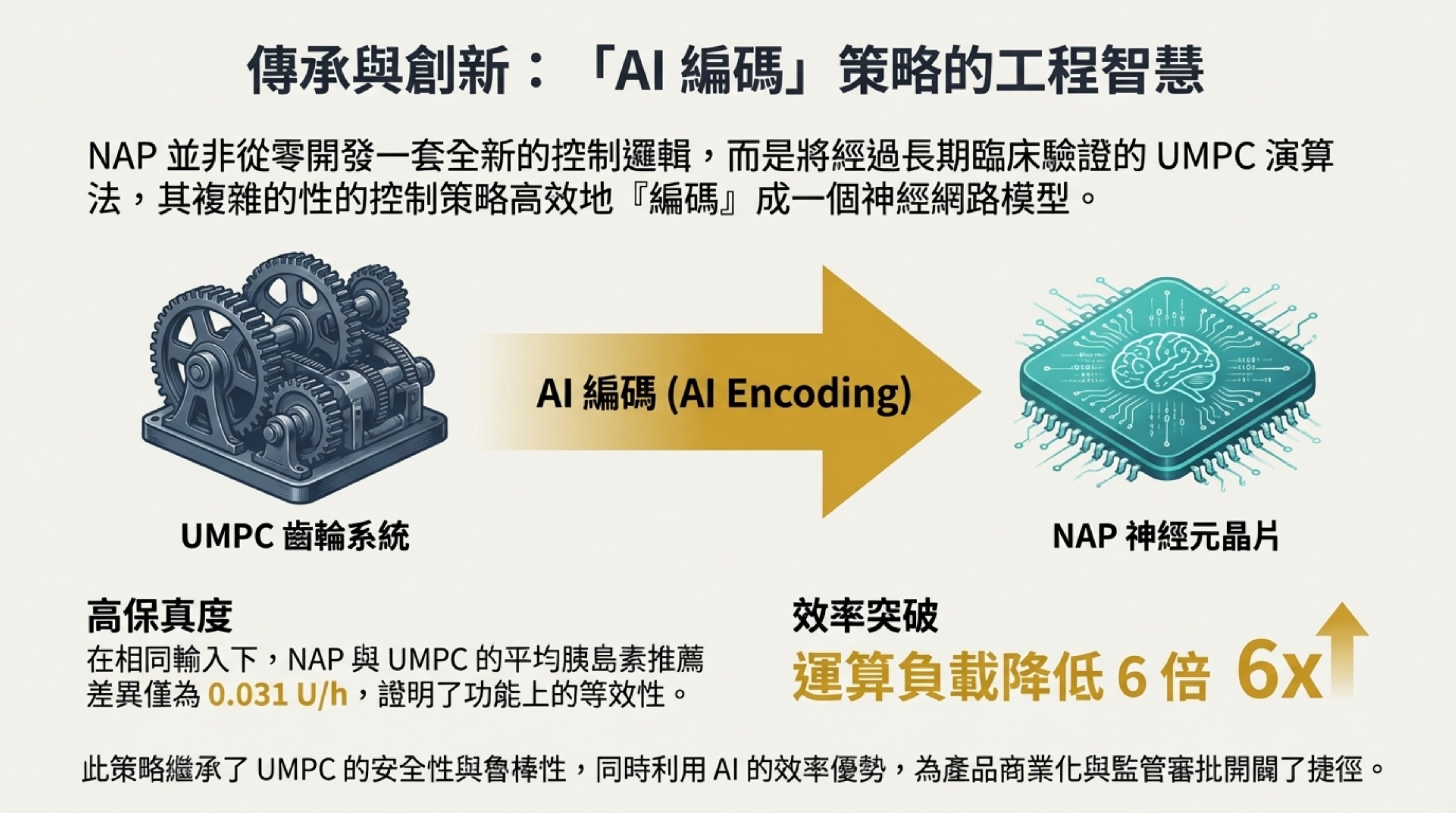 AI 編碼(AI Encoding): NAP 並非從零創造控制邏輯,而是將經過長期臨床驗證、計算複雜的 UMPC 演算法「編碼」進神經網路模型中 。